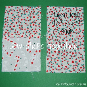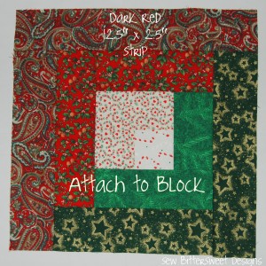 For my block I used a total of 6 fabrics. I start with a small light print that had both red and green in it and added three more reds, each slightly darker than the previous and two greens.