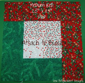 Medium red strips: 1 – 2.5 in x 6.5 in, 1 – 2.5 in x 8.5 in
