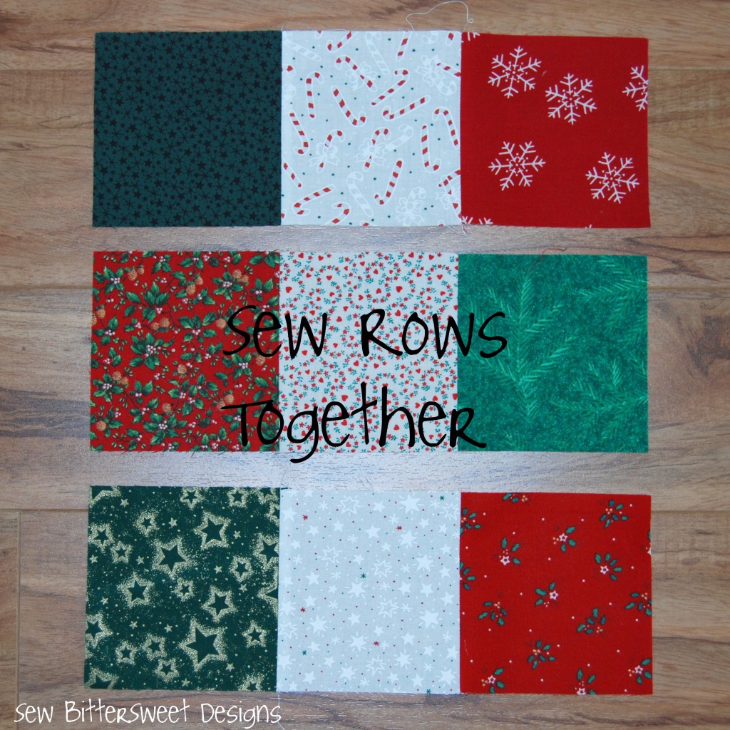 Using a 1/4 inch seam – sew your rows together. Press your top row seams to the right, middle row to the left and bottom row to the right again – this will assist you in matching up your squares when finishing the block.