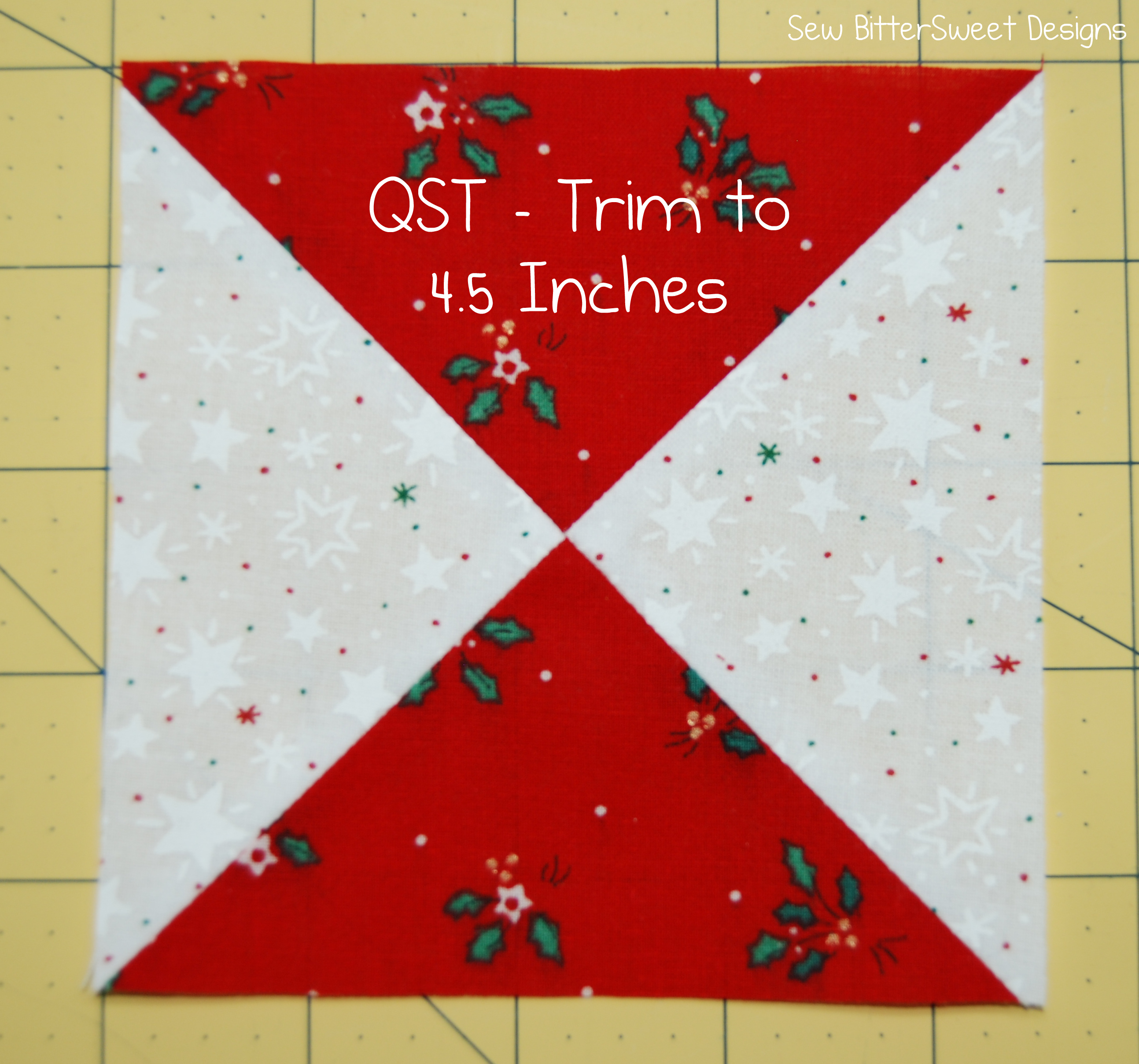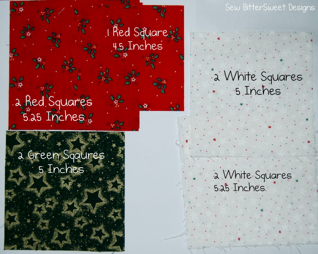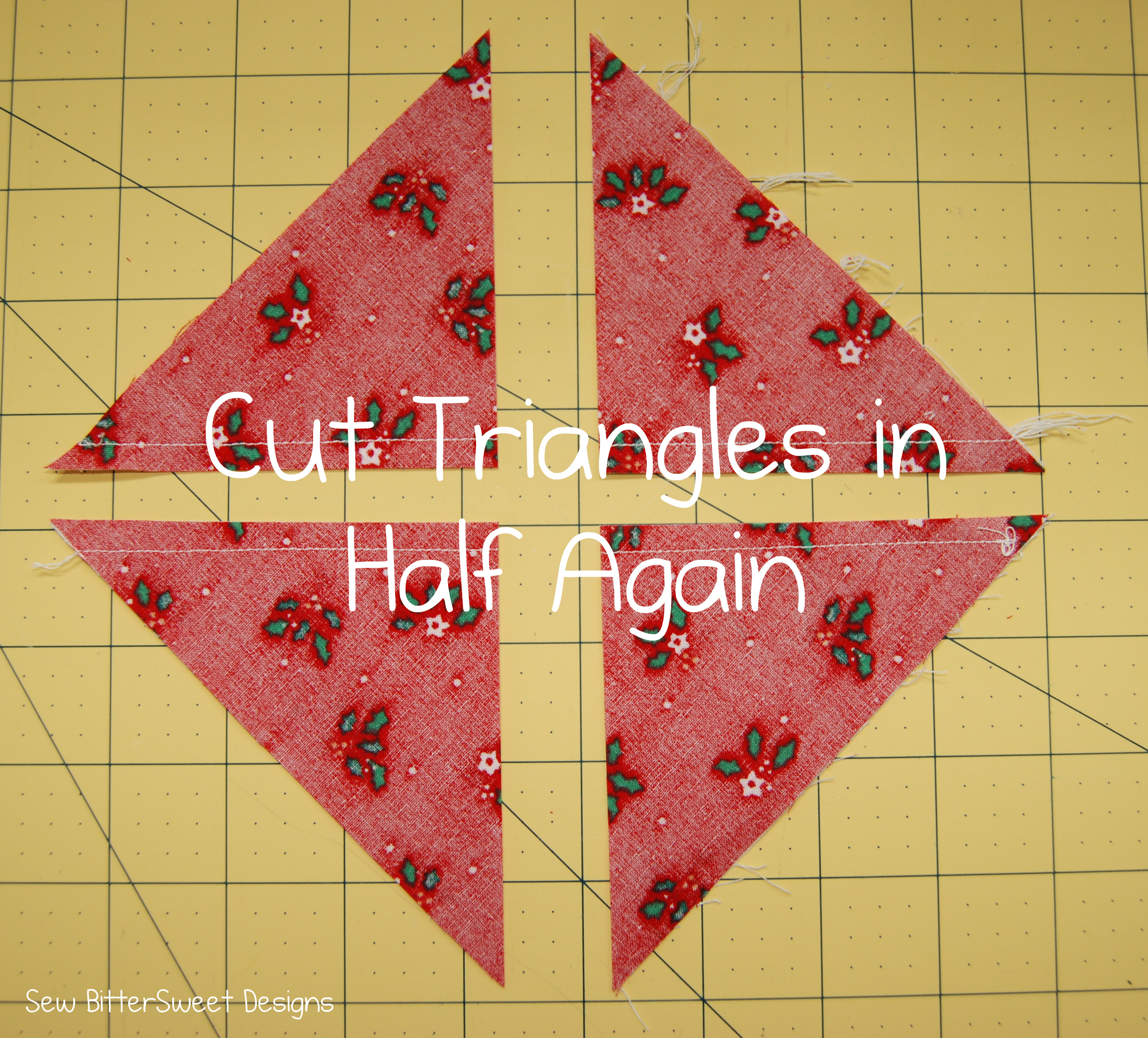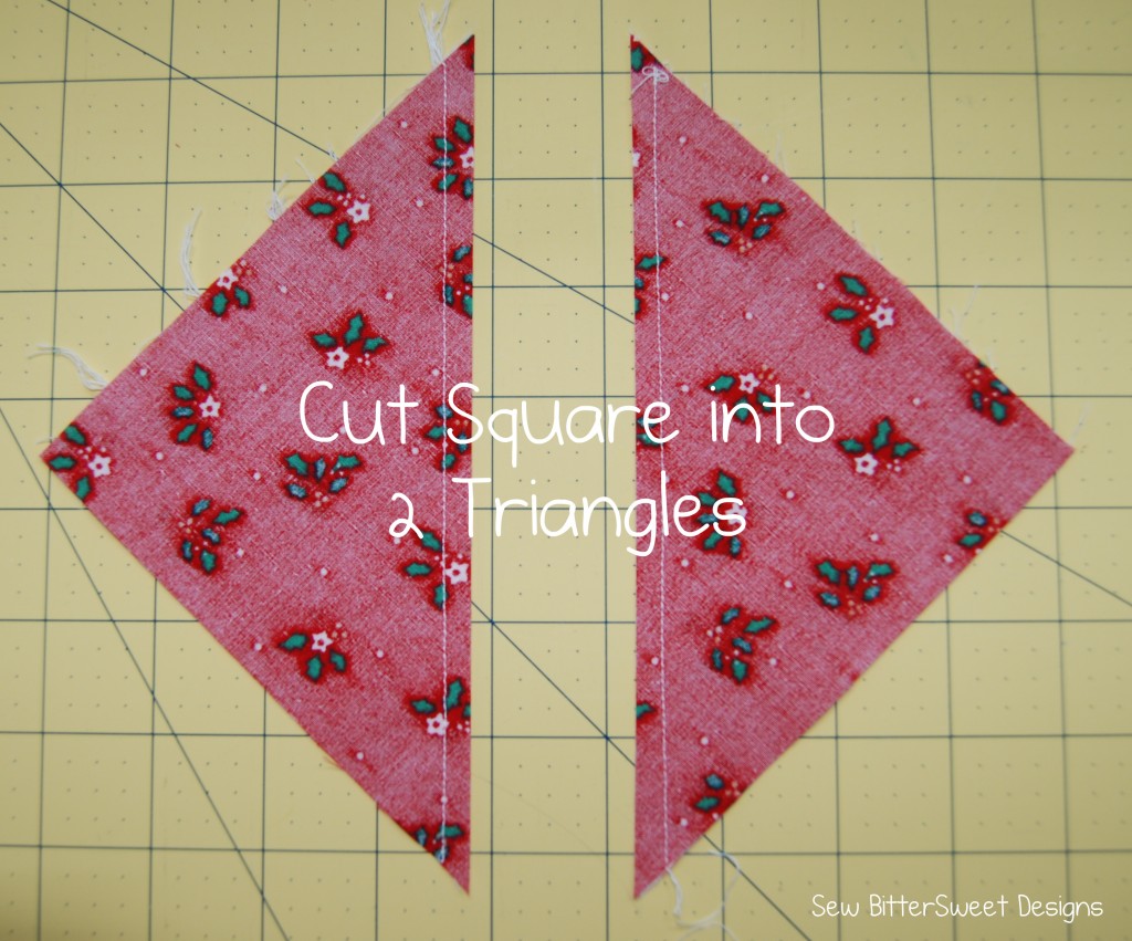 You now have enough triangle to make 2 squares. Repeat with the other red & white 5.25 inch squares.