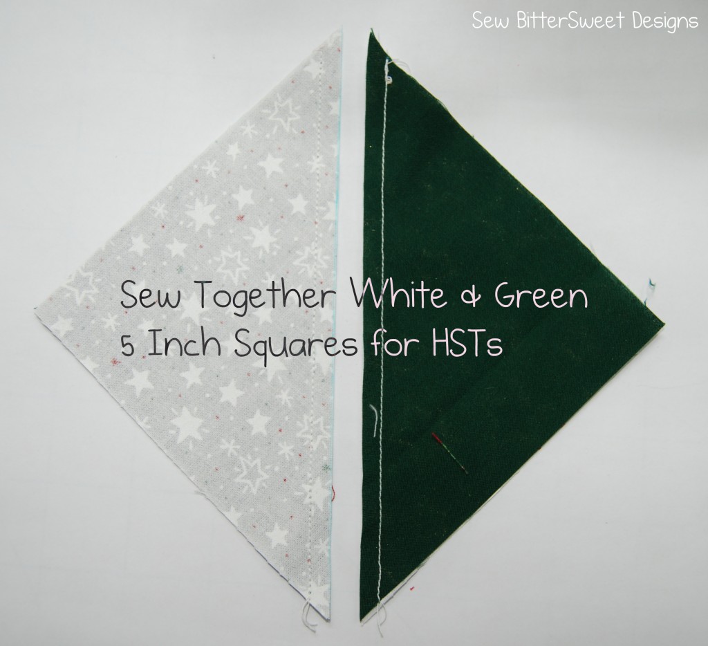 Next, make your half square triangle using the white and green 5″ squares. Using the same method from the QSTs, mark on the white fabric – corner to corner, place white and green fabrics right sides together, and sew 1/4″ on either side of marked line. For Half Square Triangles – you only cut ONE time.