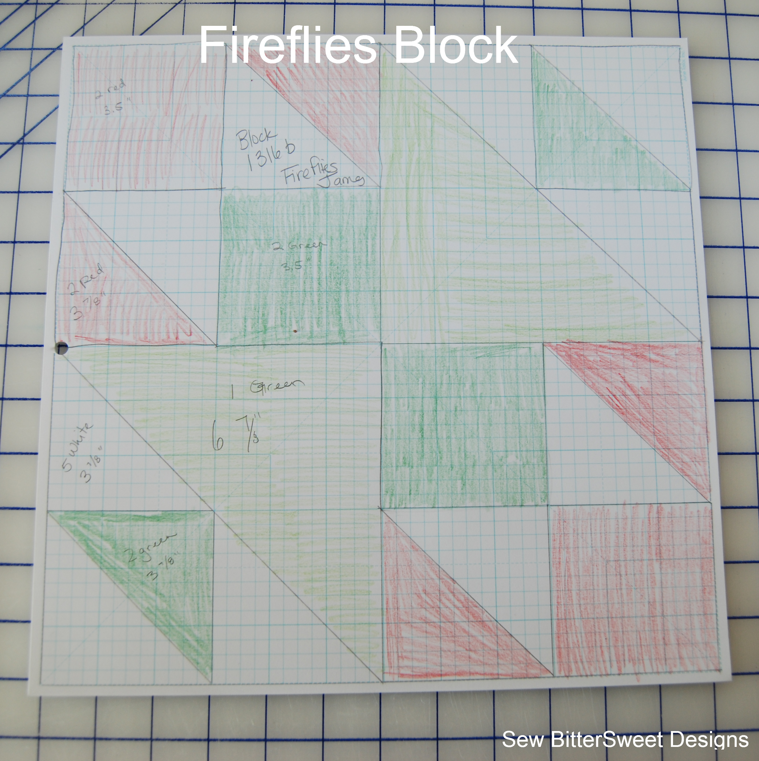I started out as I usually do – sketching the block onto my quilting graph paper to determine the appropriate cutting measurements. Note: when using graphing paper – you are drawing out the FINISHED size of the block – this means you will need to add half an inch to each block to account for seam allowances.