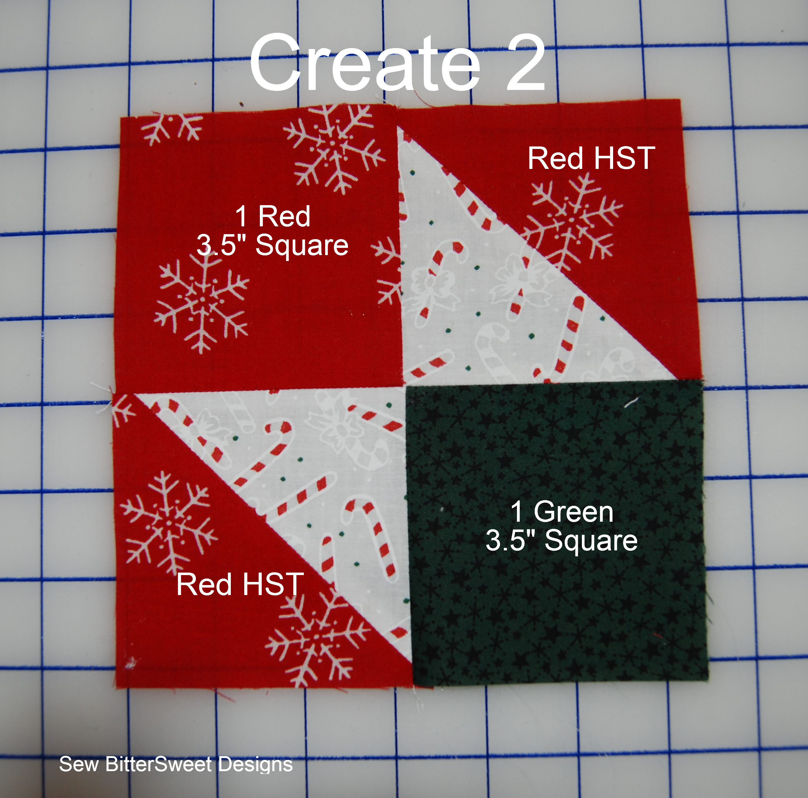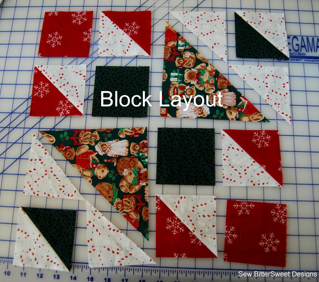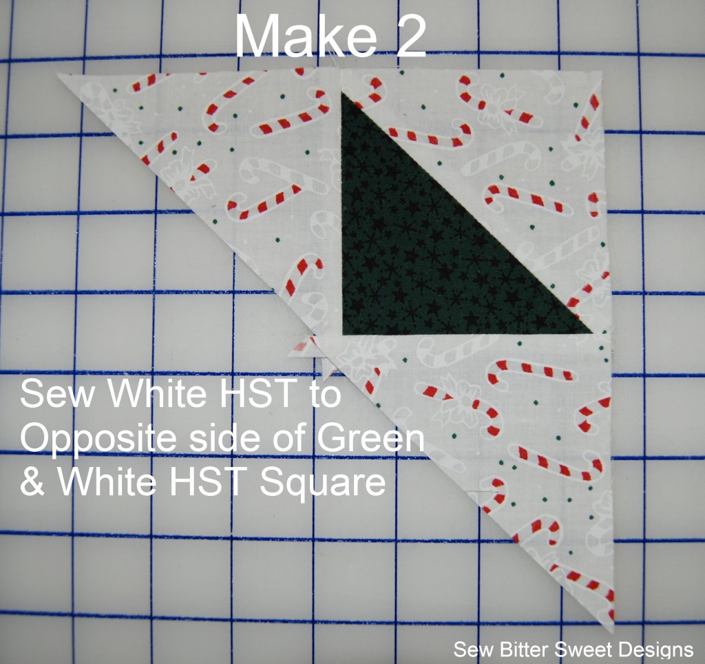 Pair the 3 remaining 3 7/8″ white squares with the 2 Red and 1 Green Squares measuring 3 7/8″. Create half square triangles.