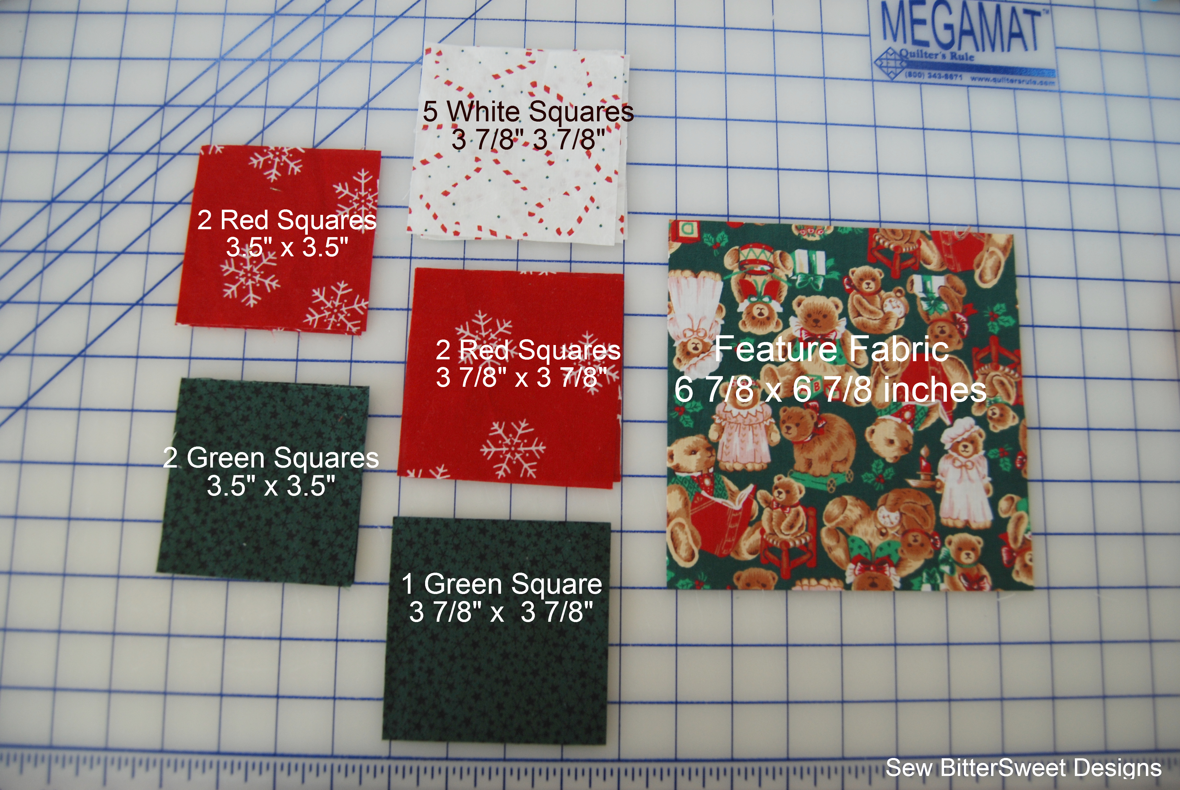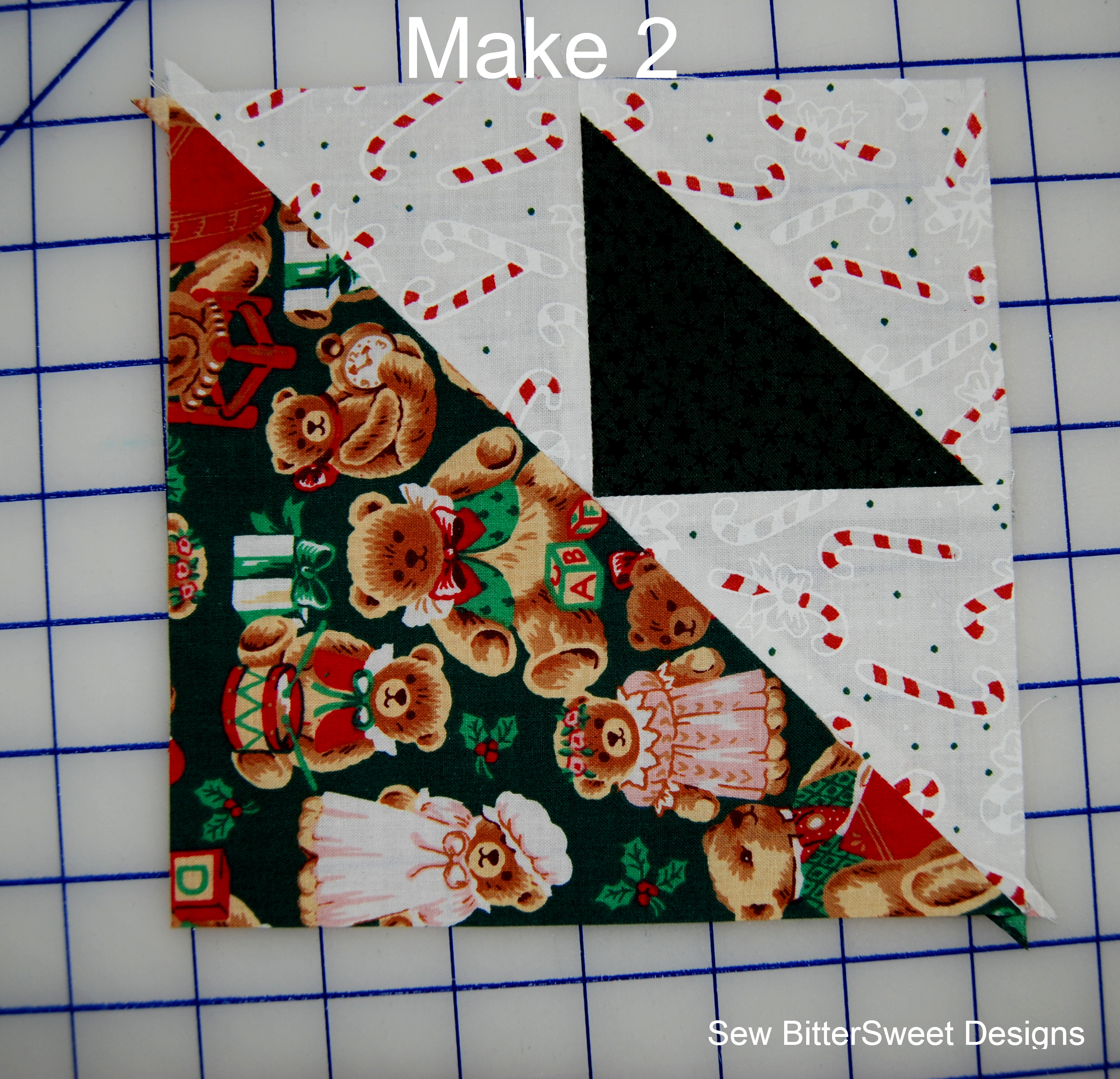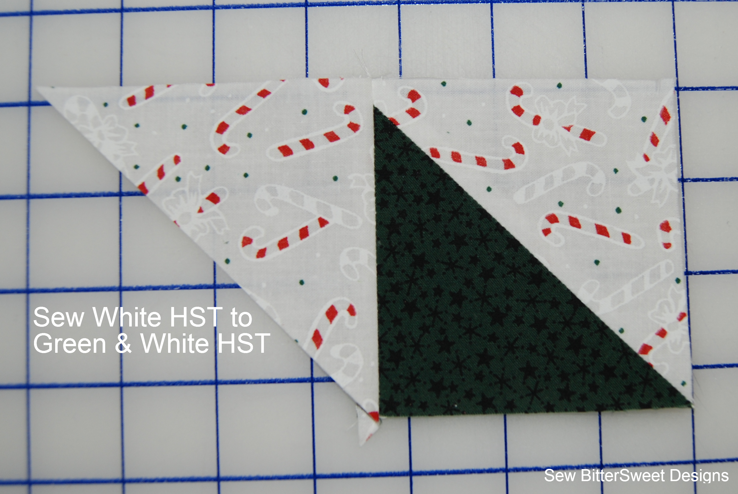Pair the 3 remaining 3 7/8″ white squares with the 2 Red and 1 Green Squares measuring 3 7/8″. Create half square triangles.