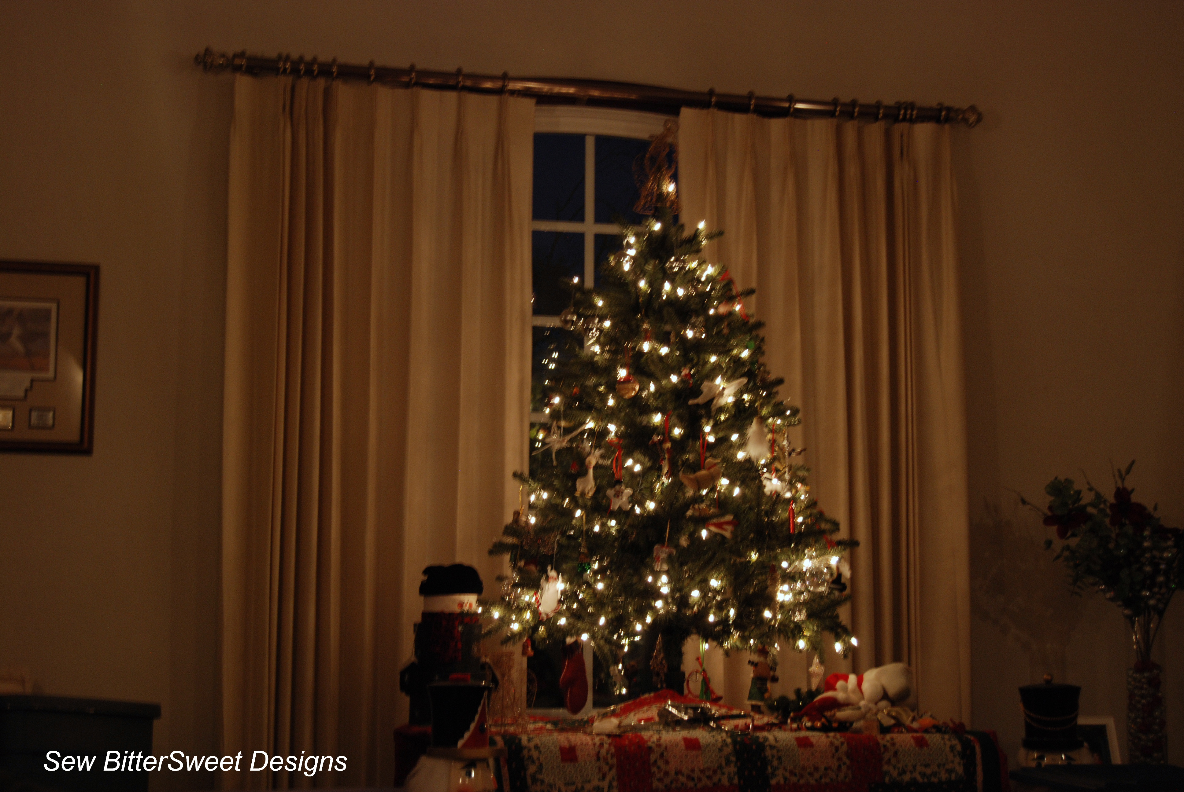 And here is our tree. It is a small fake tree up on a table. I am allergic to the real deal so fake it is! The up on a table part is convenient because it makes it that much harder for Anne and the cat to pull down ornaments!