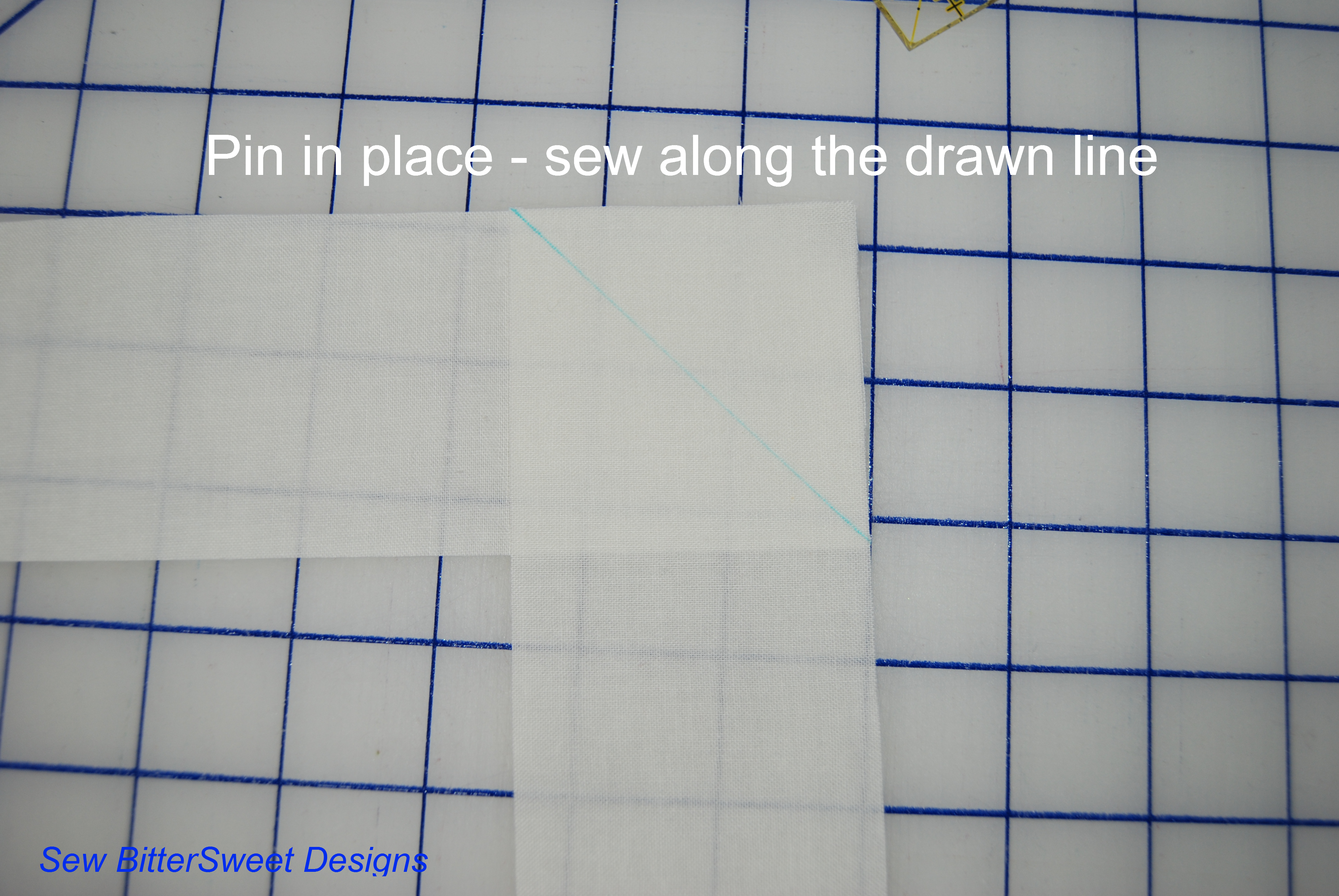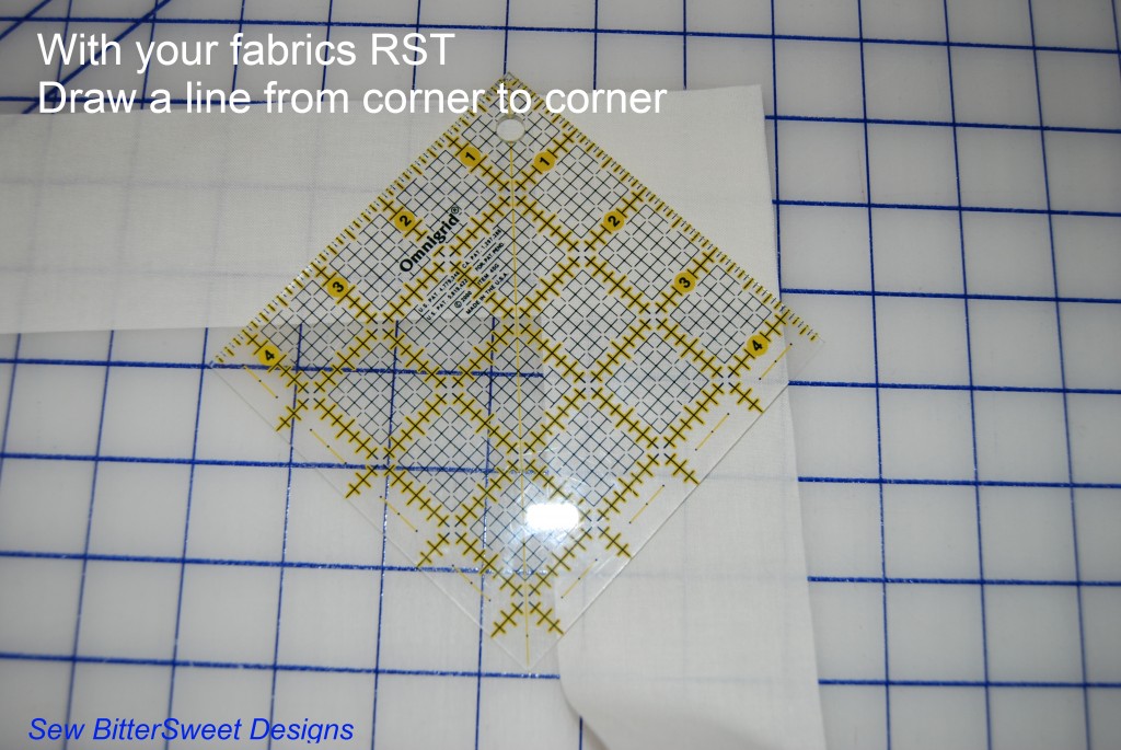 Placing fabric corner to corner, right sides together, take a ruler and draw a line with an air or water soluble pen/pencil from corner to corner.