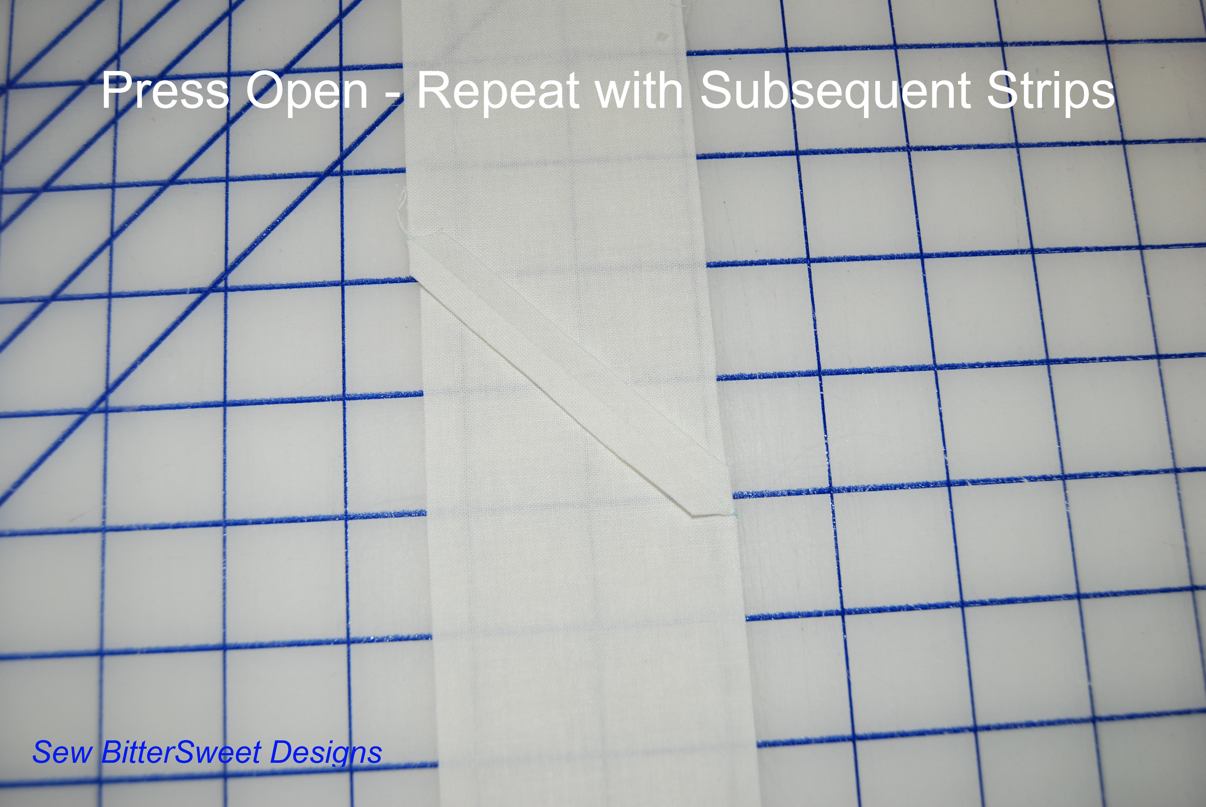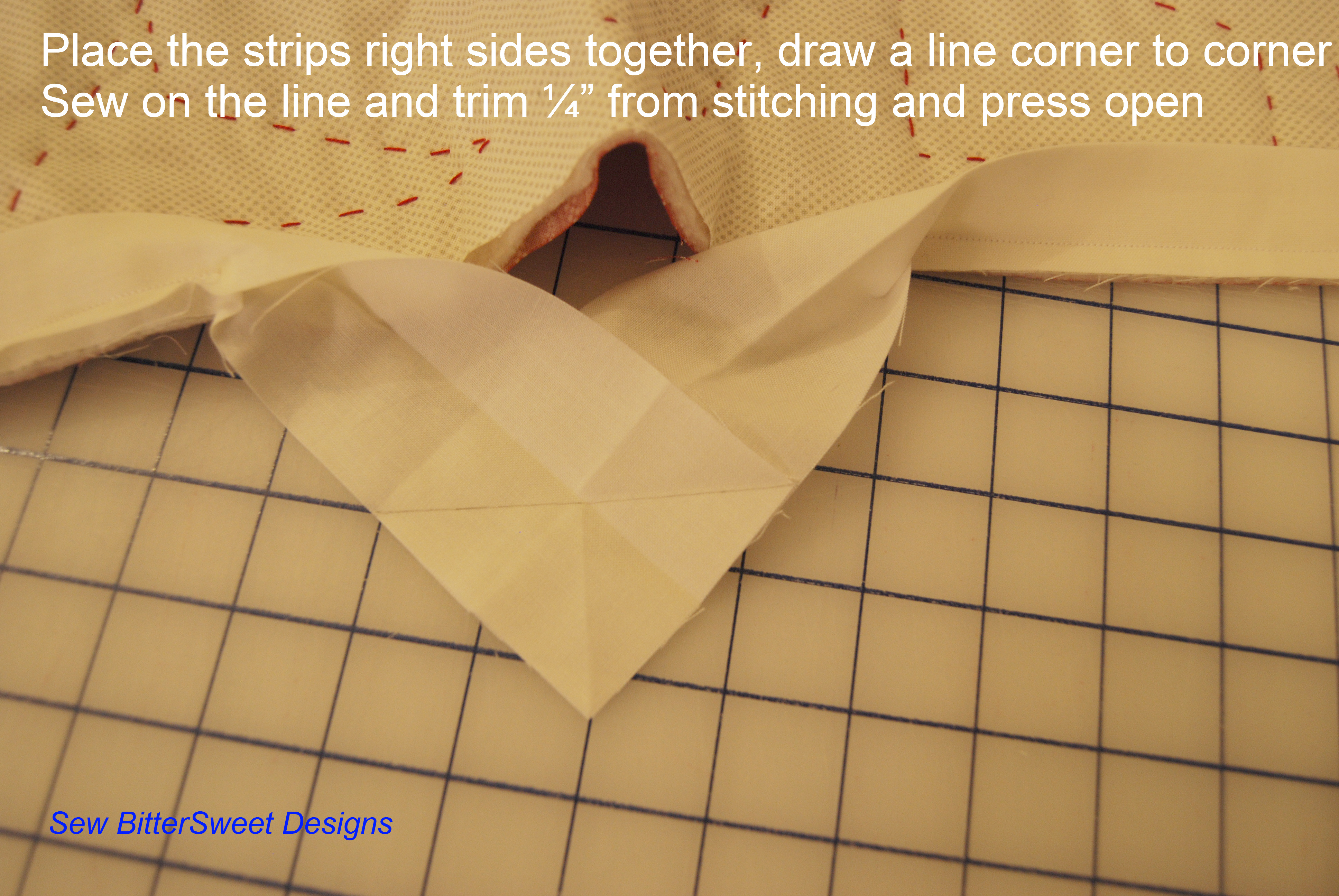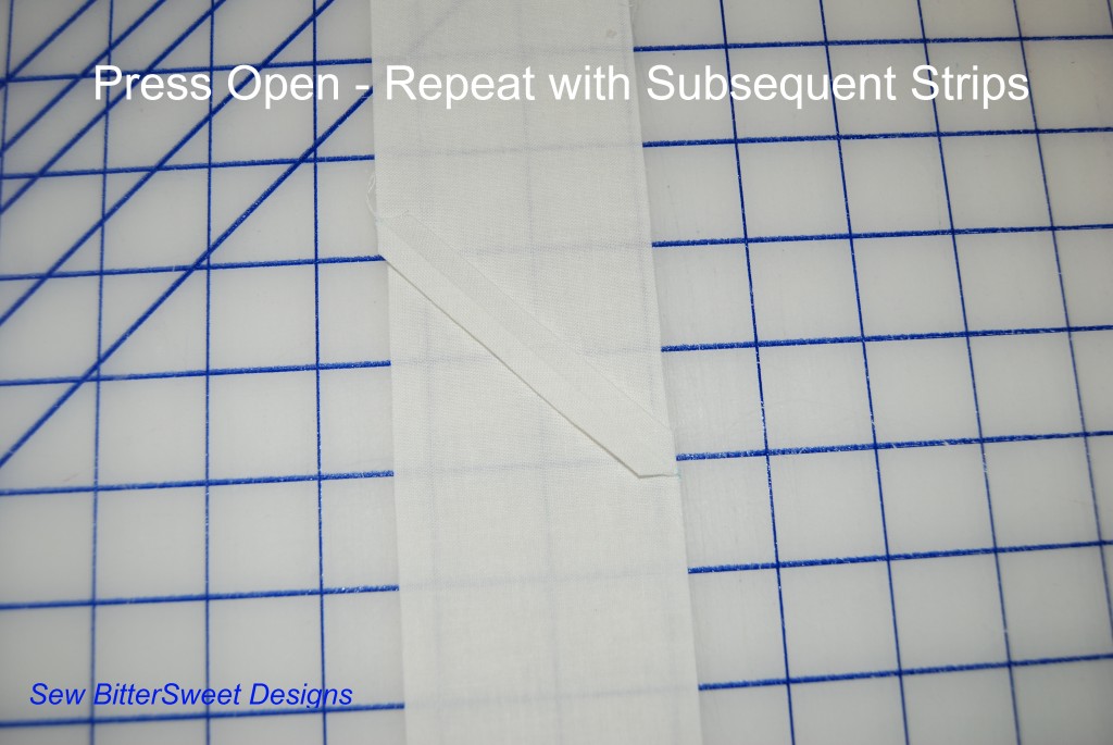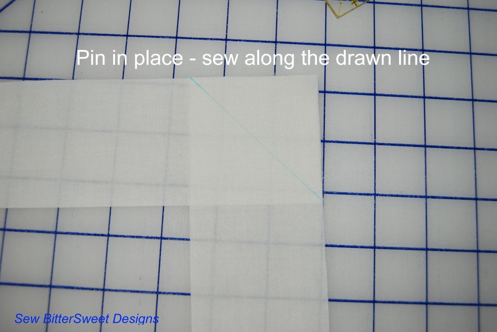 Place the strips right sides together, draw a line corner to corner, sew on the line and trim ¼” from stitching and press open