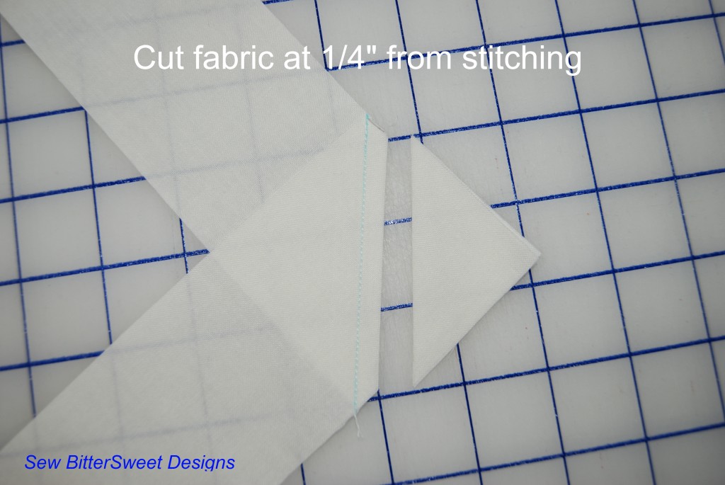 Place your ruler with the ¼” mark on stitched line – trim triangle off