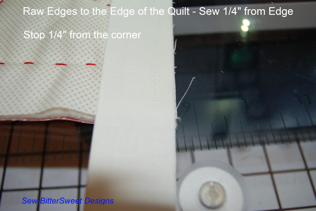 Sew the strip to the quilt with a ¼” seam. Stop sewing when you are ¼” from the corner.  (I like to measure with a tape measure and place a pin so I know where to stop).