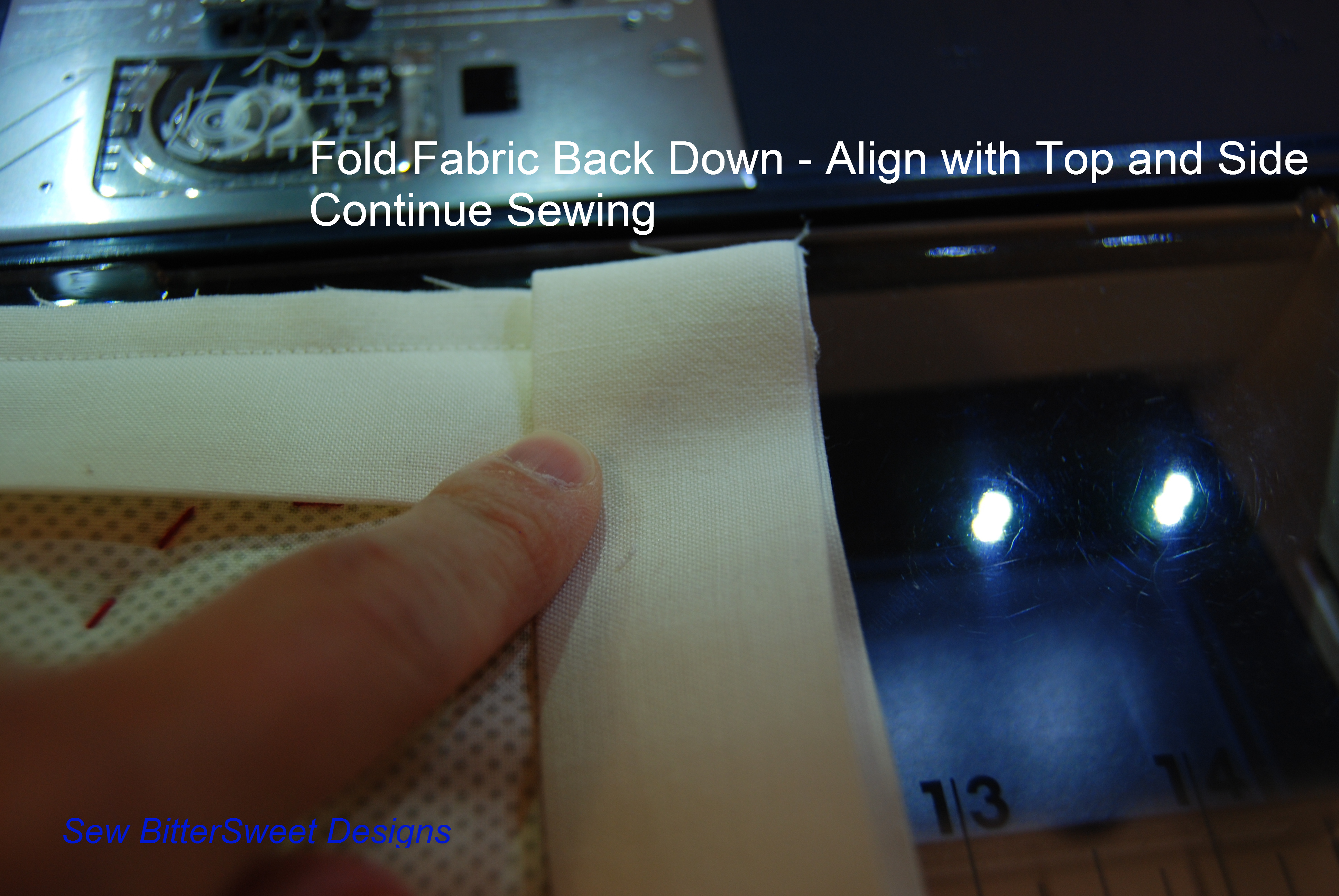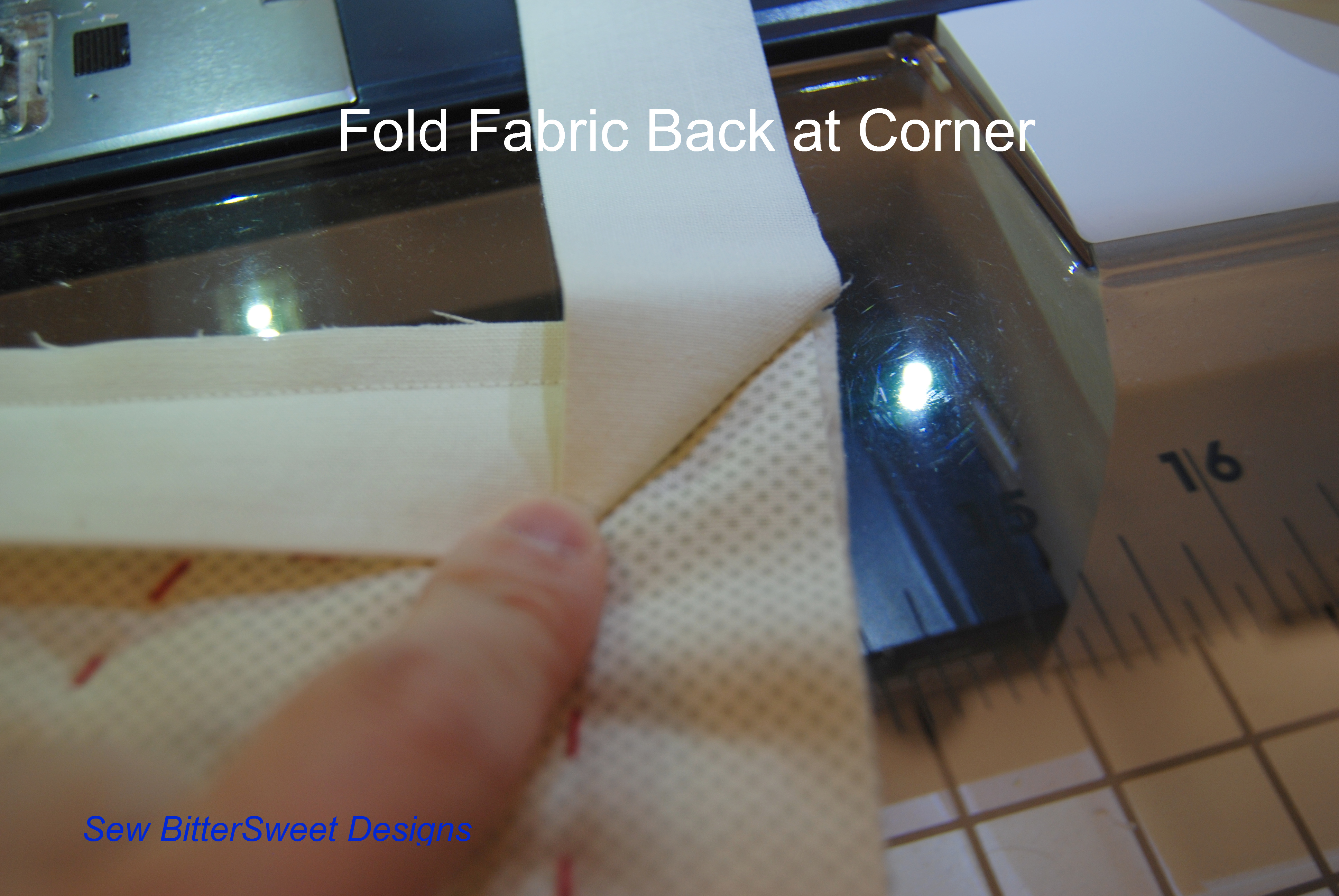 When you reach the corner, you will want to fold the fabric back (refer to picture)