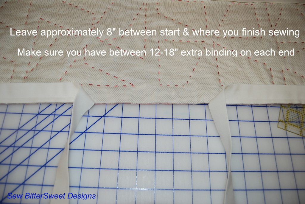 Note Before: when you are going to do the entire binding on the machine – sew your binding to the back first. If you plan on hand sewing your binding down – sew your binding to the front first!