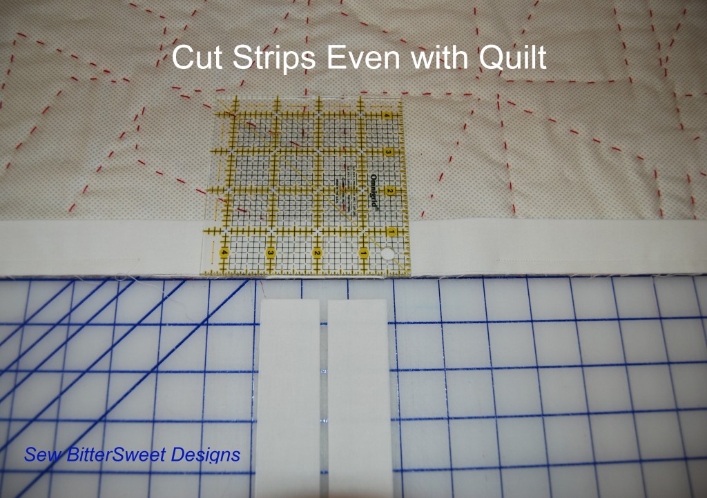 Using a quilting ruler – place it on the edge of the quilt and cut off the excess fabric from the binding strips.