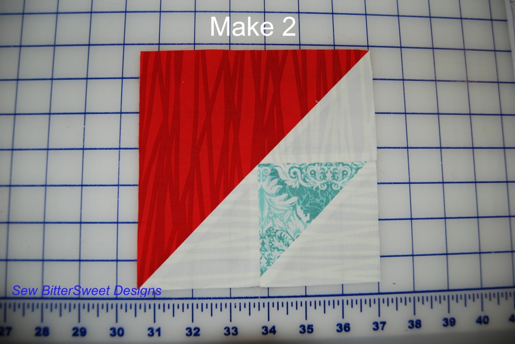 Next – take your large red triangles and assemble two 6.5″ blocks: