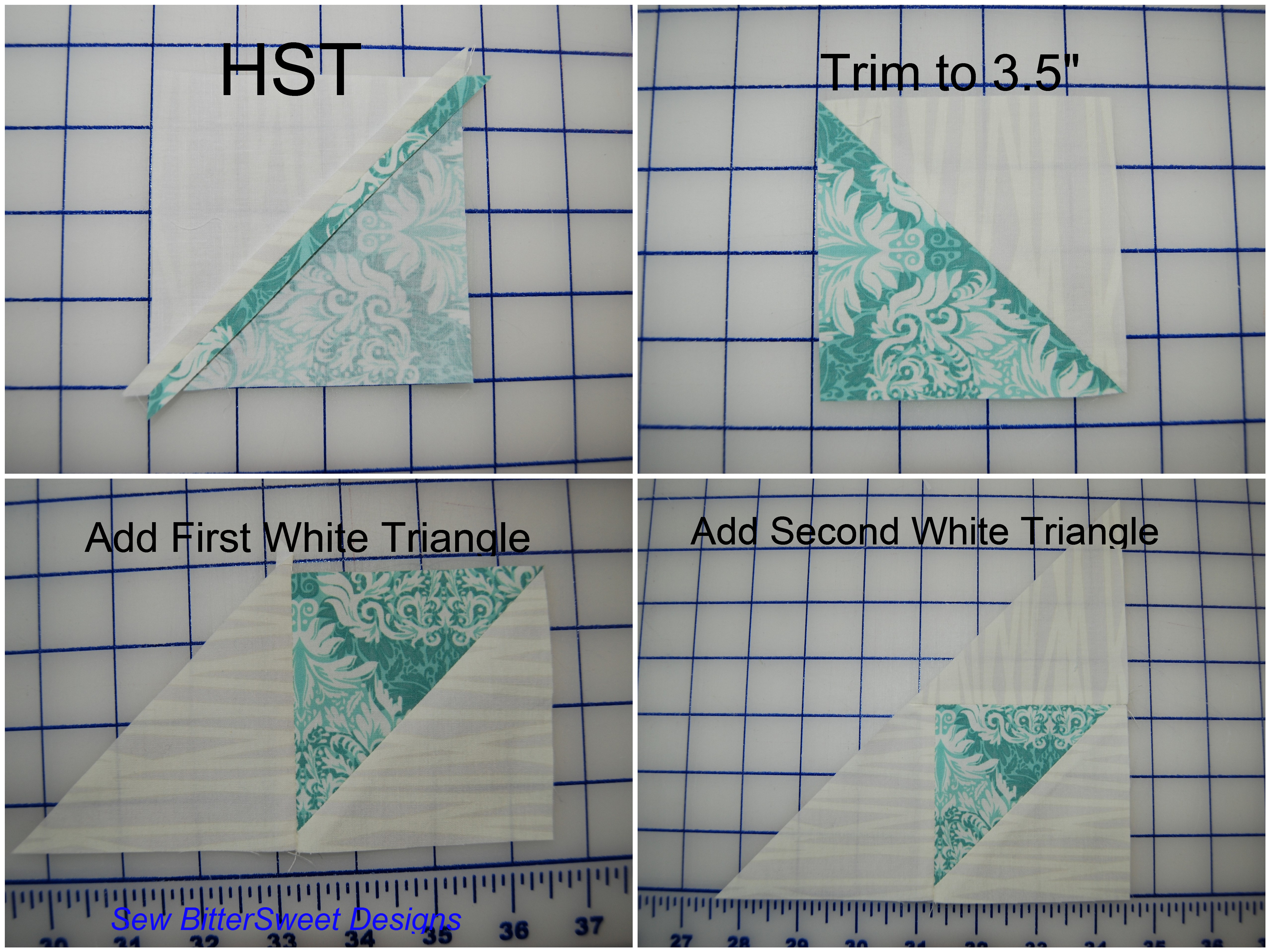Next – take 2 of your HSTs and assemble your large triangle sections (make 2):