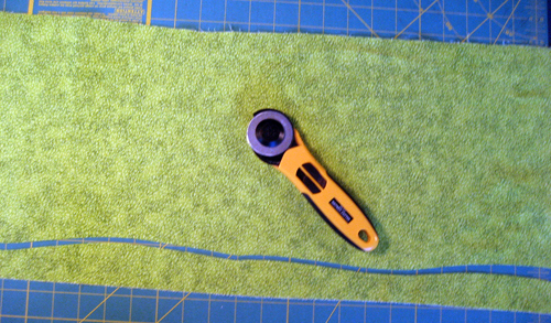 For the grass, use your rotary cutter to cut a gentle curve from your green fabric the length needed (~31”). You don’t need to have fusible web on this piece, but you can if you want. I used a glue stick to attach the grass to my background fabric.
