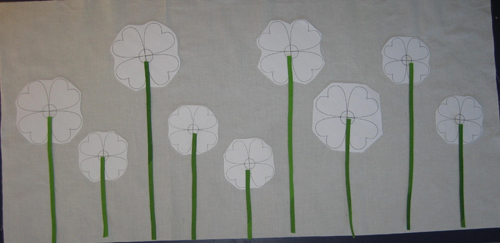 Using the last page in this file, print and roughly cut out the flower shapes. On your background fabric, place the paper flowers in a layout that is pleasing to you. Cut your bias stems (or ric rac) to the lengths needed.