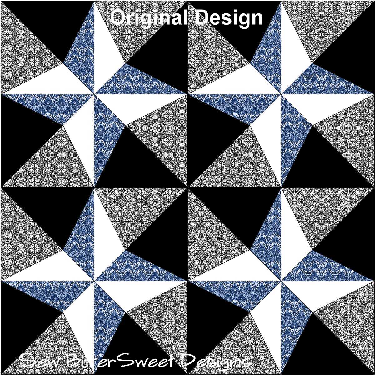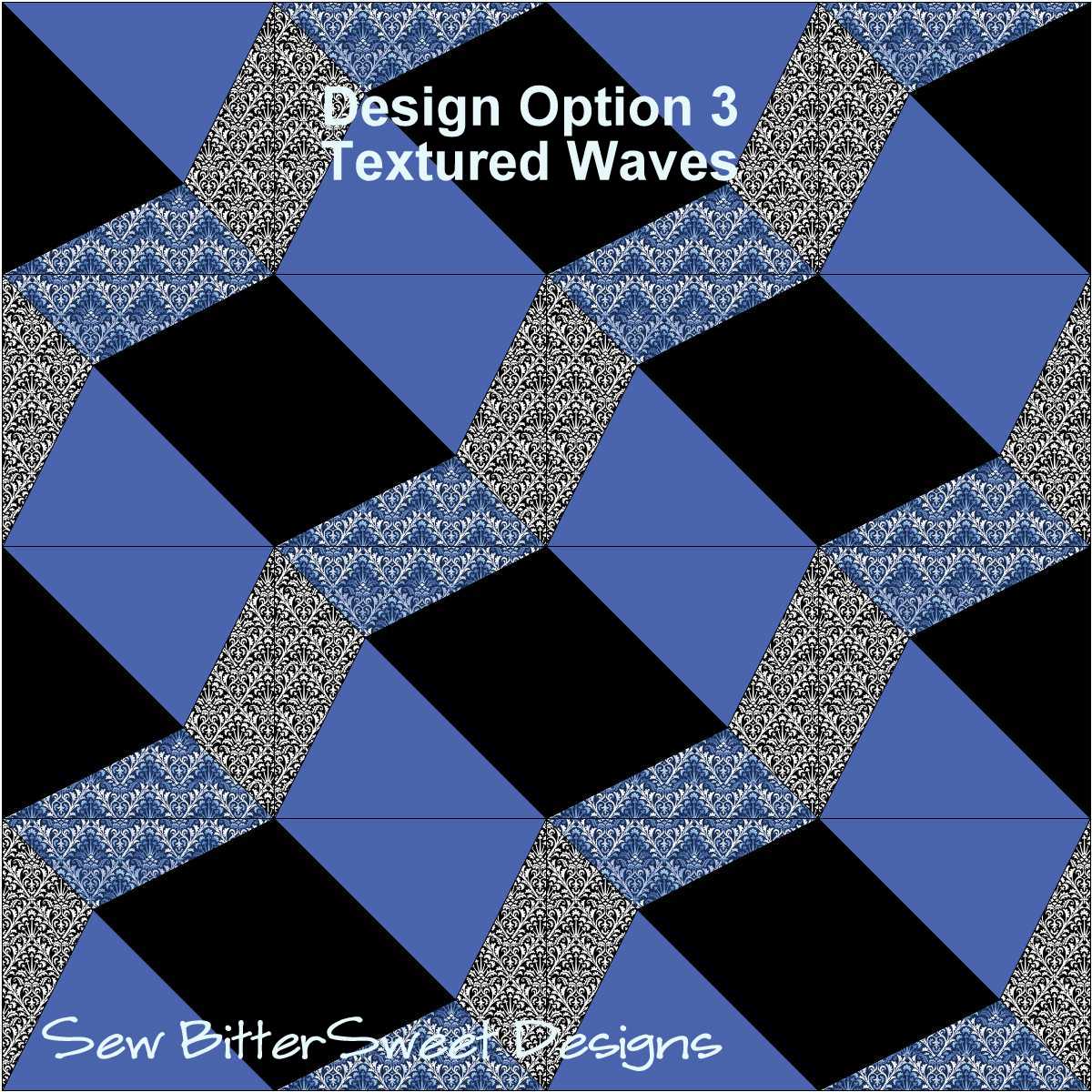 I especially love the last way of putting them together. I always like designs that make more than one possibility. The blue you used looks so great in the distance pictures, as if it’s flowing water. I didn’t realize until the close-up what kind of print it was!