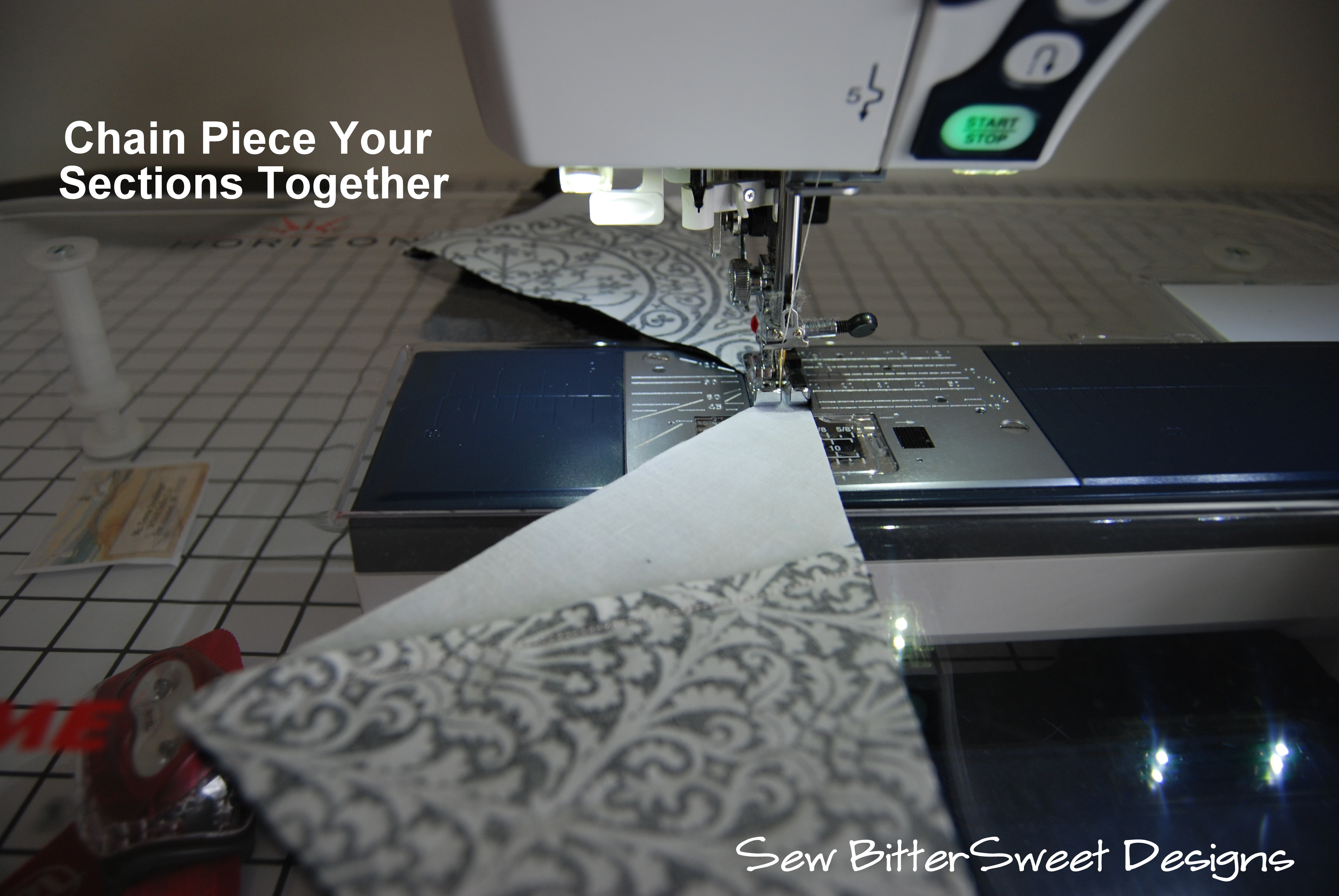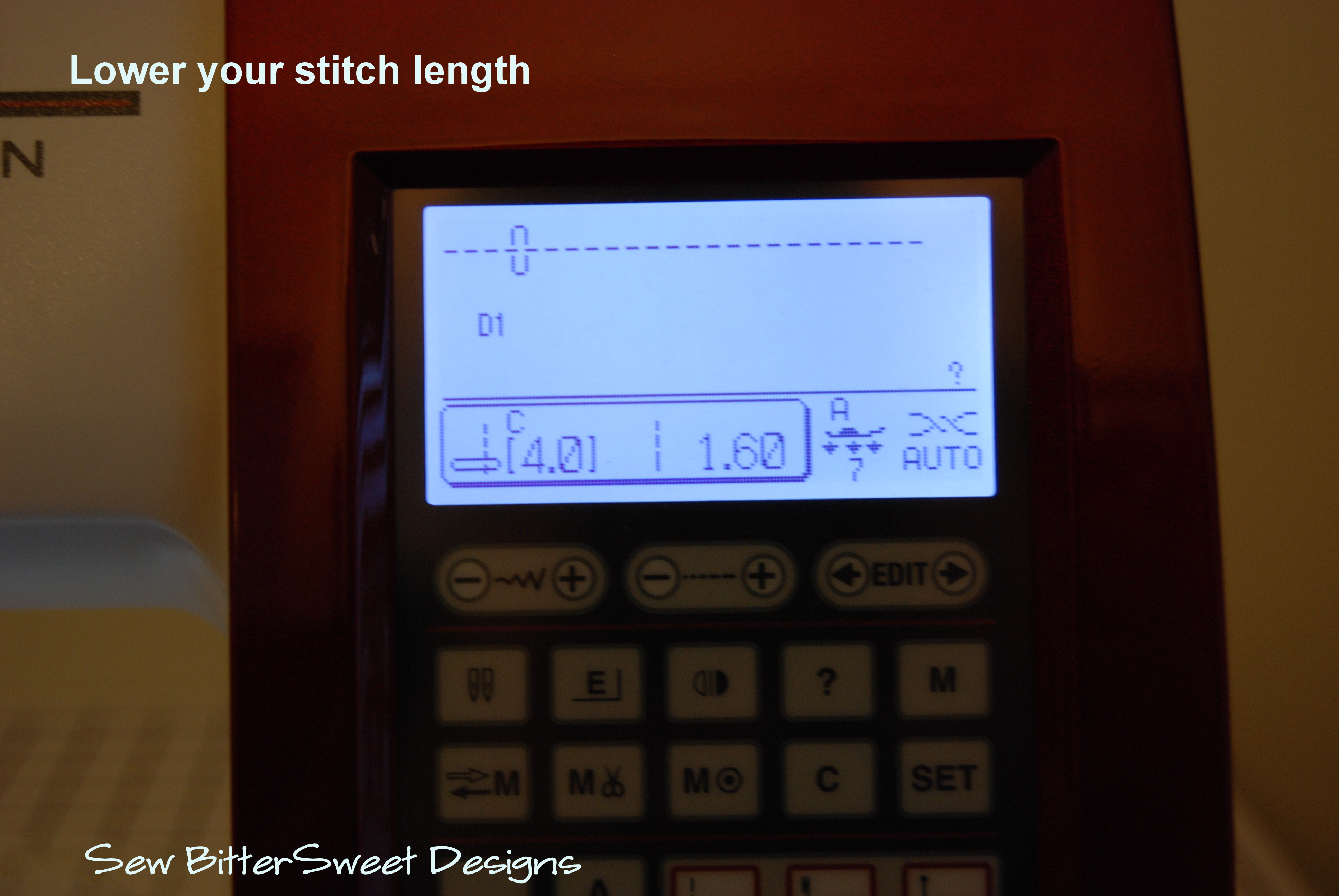 I like to start by lowering my stitch length; this makes it easier to tear off the paper when you are done with your piecing. I lower mine down to 1.6.