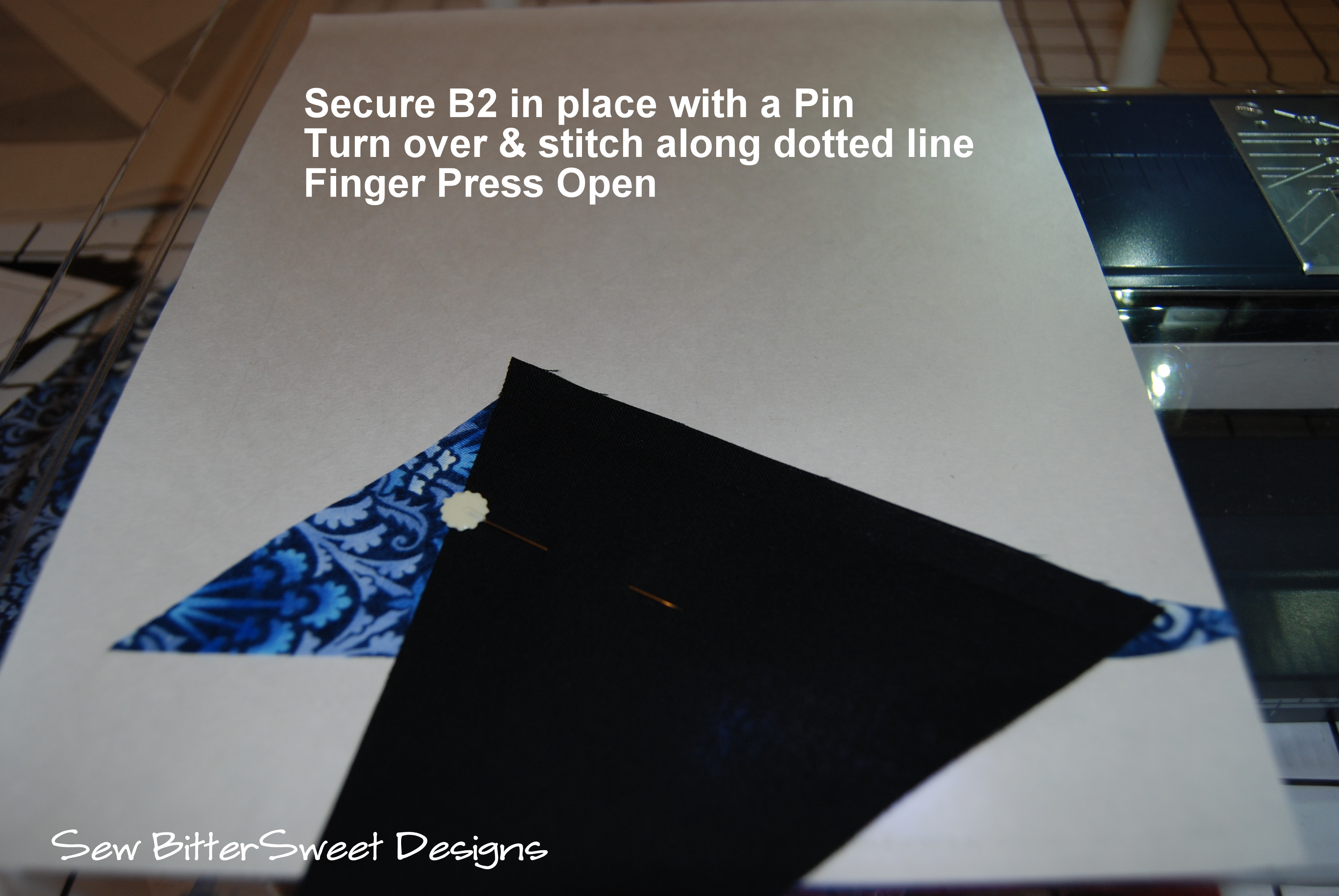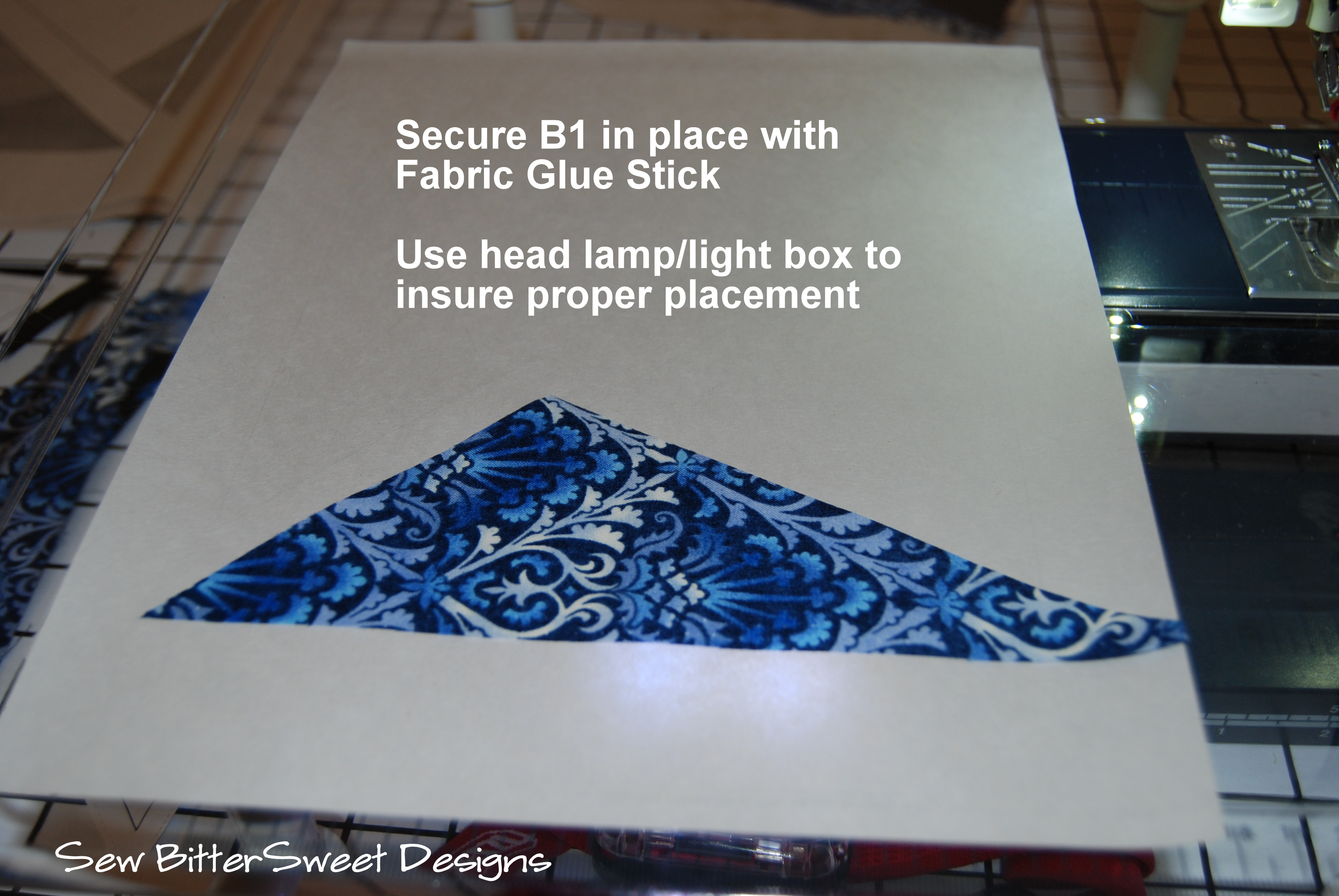 If you have a clear plastic sewing table – like the one that came standard with my machine, I recommend putting a light underneath it – this will help you arrange your pieces to be perfectly in line with your paper piecing template.