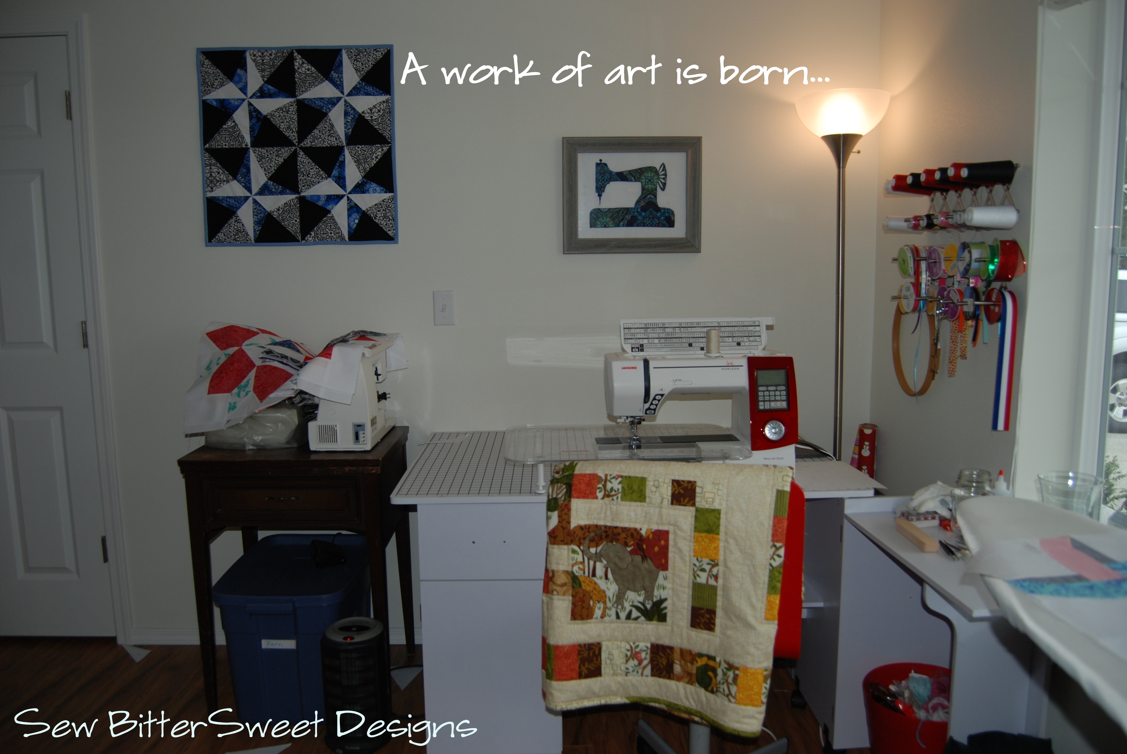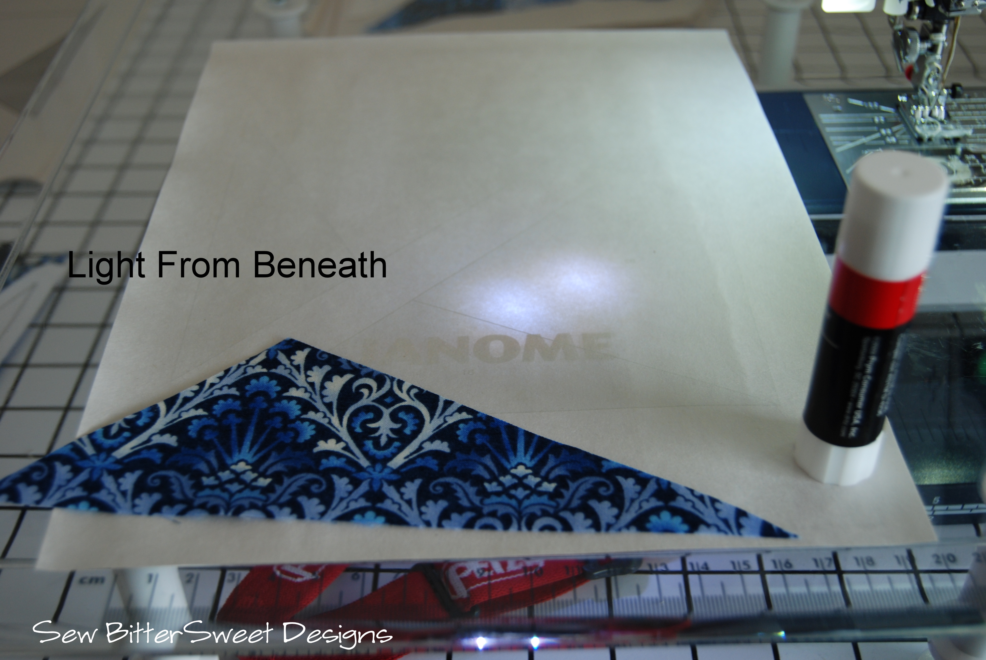 As you can see in the picture below, the bright light from underneath will help you align your pieces and it allows you to not only sew at night when you can’t look out your window for natural light, it also saves fabric – you can more precisely line things up and won’t have to use big pieces.