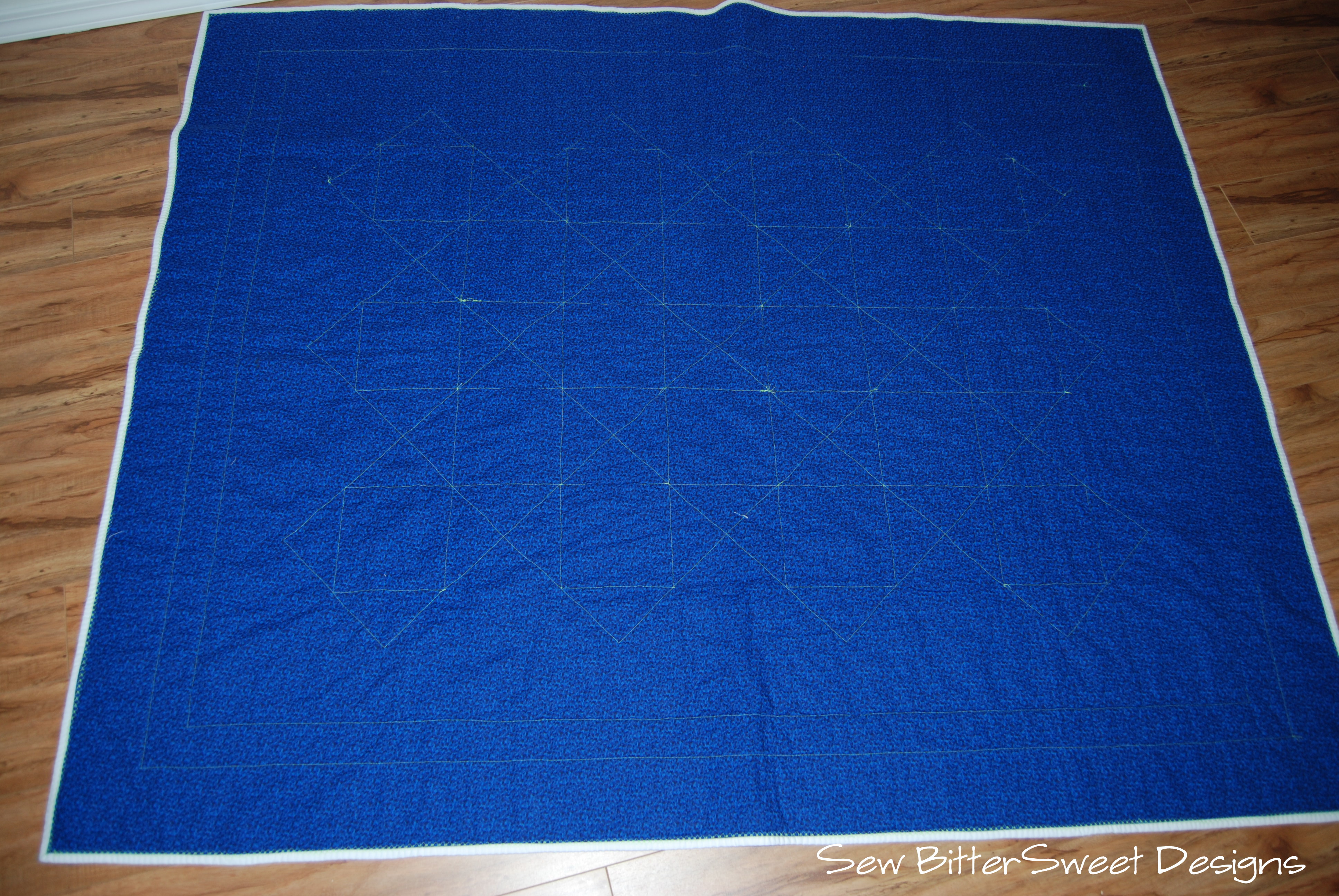 Throughout all the quilting I didn’t have a single break. It is also the first quilt that I have done in one sitting. I was only going to do the large diamonds, but then I read the packaging on the batting that I used and realized that I had to quilt at least every 6-8 inches. That led me to quilt squares inside the diamonds. In the end I really love how it turned out with the additional quilting.