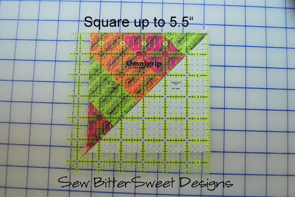 I pressed my HSTs towards the feature fabric because my background is white. You could also press your seams open if you like. You will want to trim your squares down to 5.5″ and then set them aside.