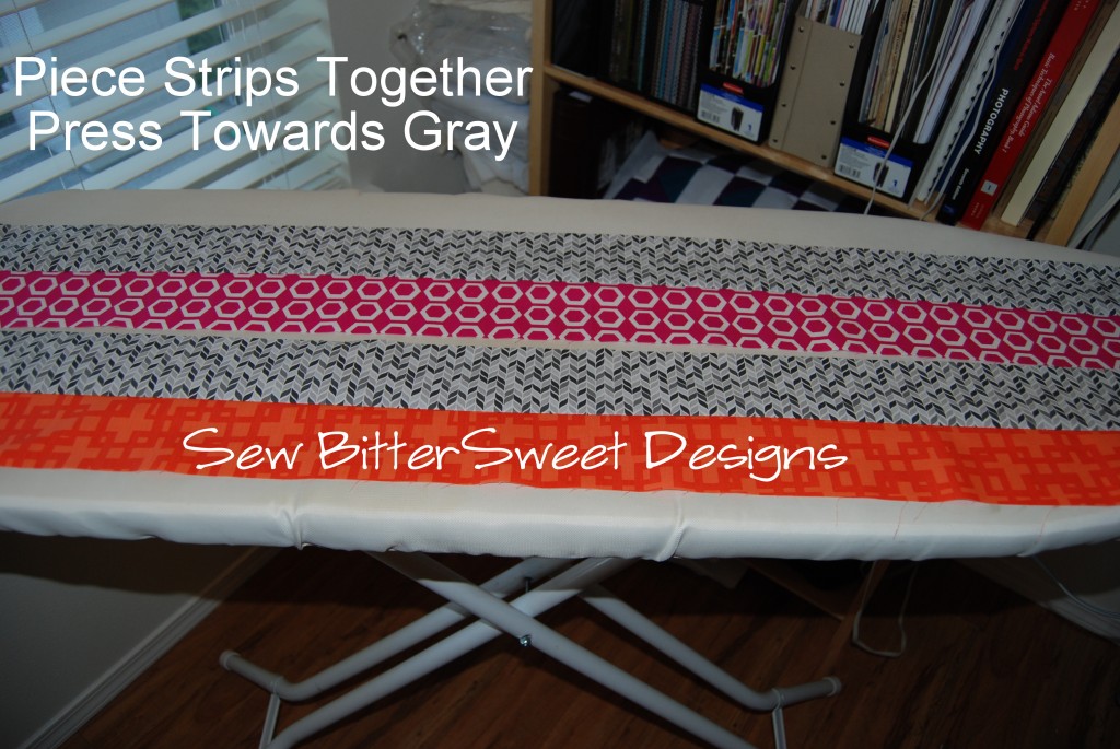 Next you will want to sew the 3 pink strips to 3 of the gray strips, and the 3 orange strips to the remaining 3 gray strips.