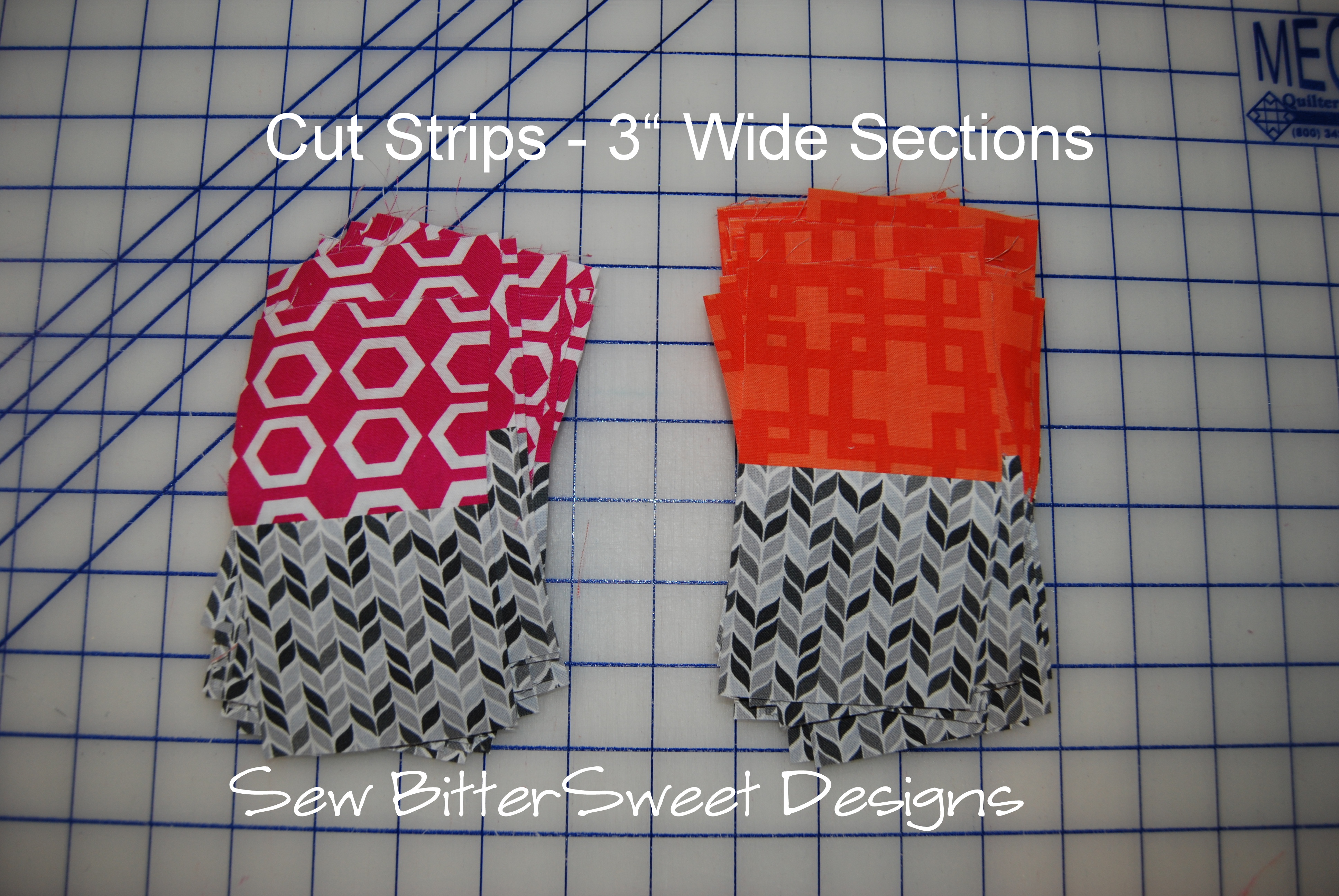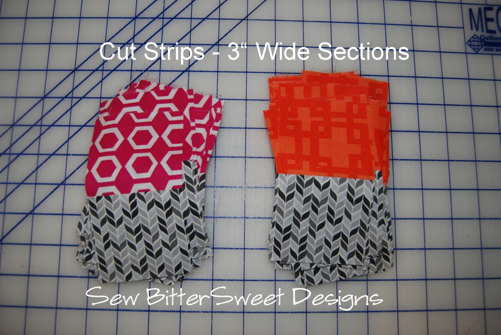 Cut your strips into 3″ sections. See picture above.