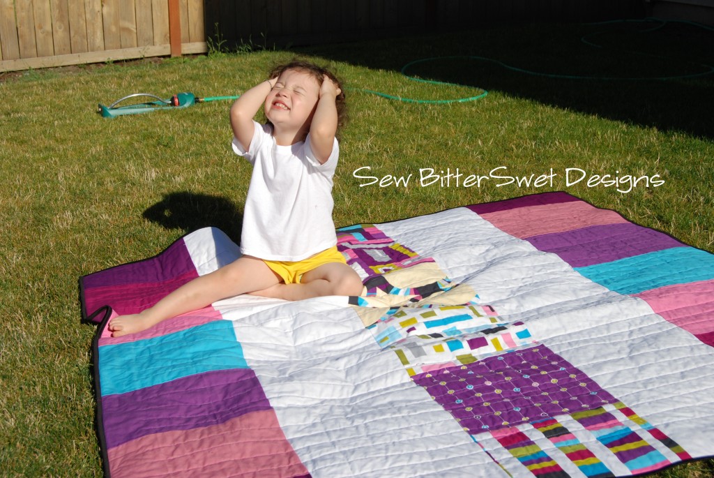 Gratuitously cute toddler picture – sun bathing on my new quilt!