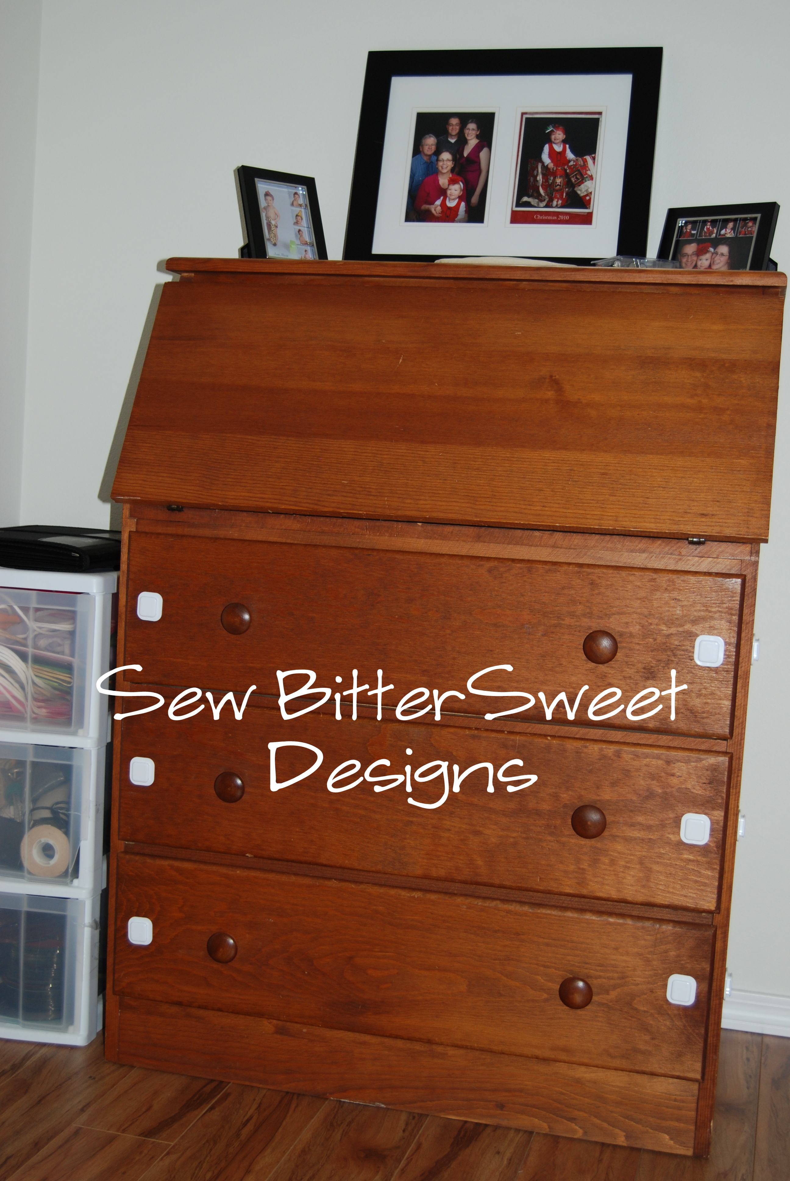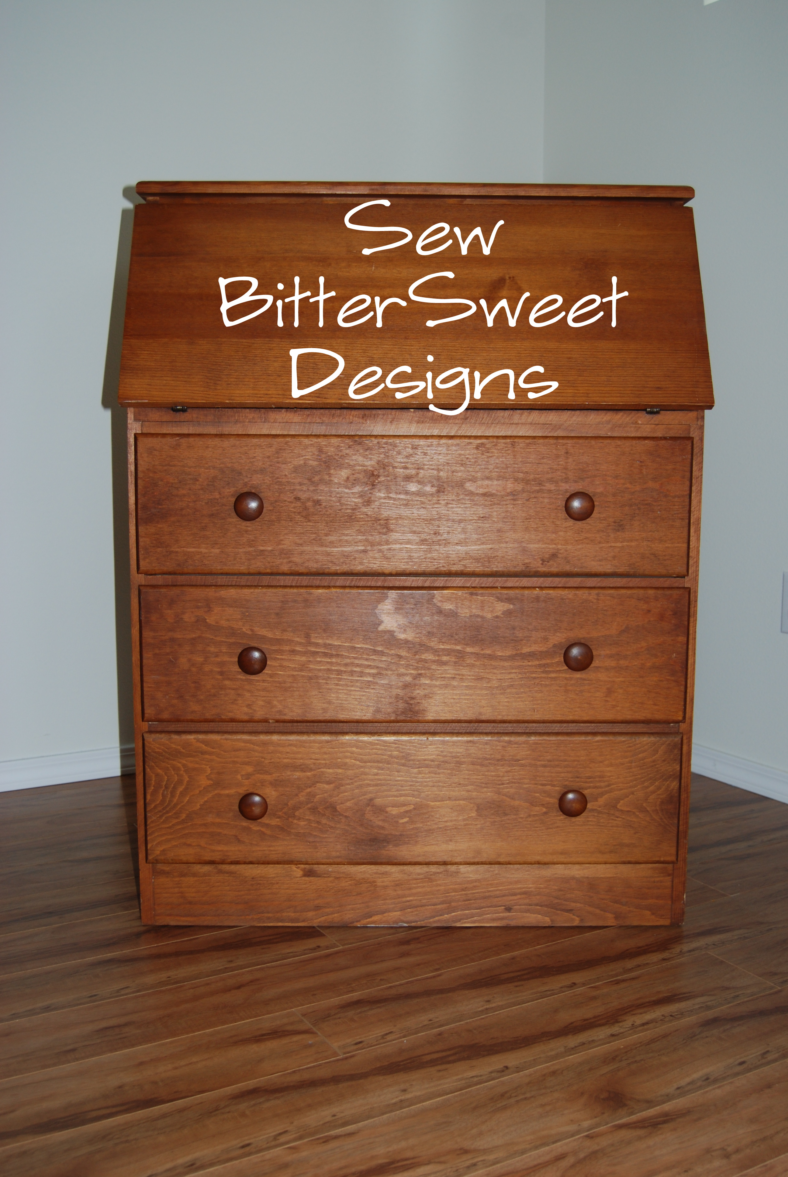 Here is the dresser in all it’s ugly glory! Now someone pointed out to me that it wasn’t ugly, and really it wasn’t, it just wasn’t what I wanted for Anne’s room. The stain was a bit too dark for my tastes.