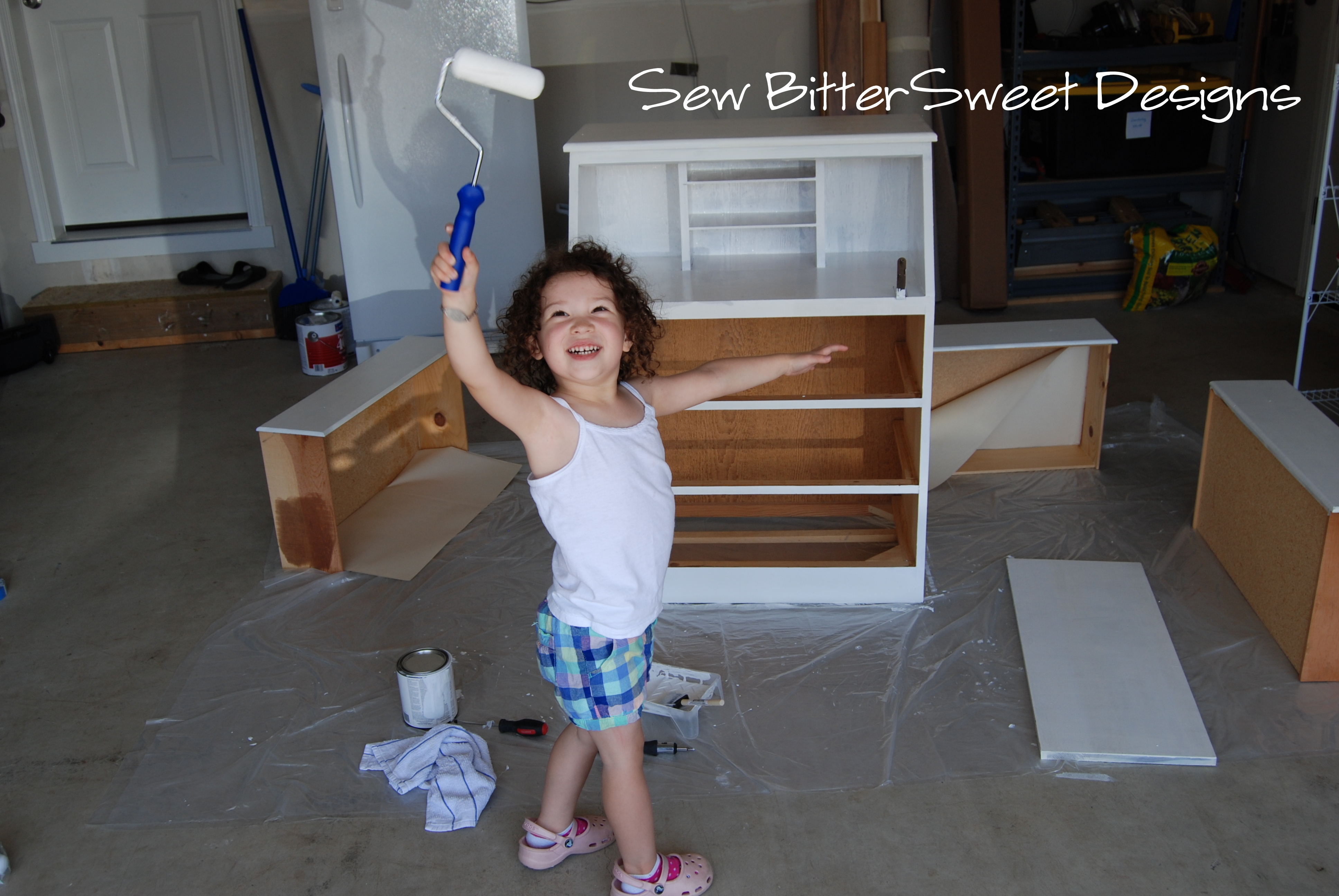 I had to do 3 coats of the latex glossy white that I picked out for the dresser, so I did one coat a day last week before it got to hot. It was the first thing we did every morning before breakfast even. Here’s Anne getting in on the action!