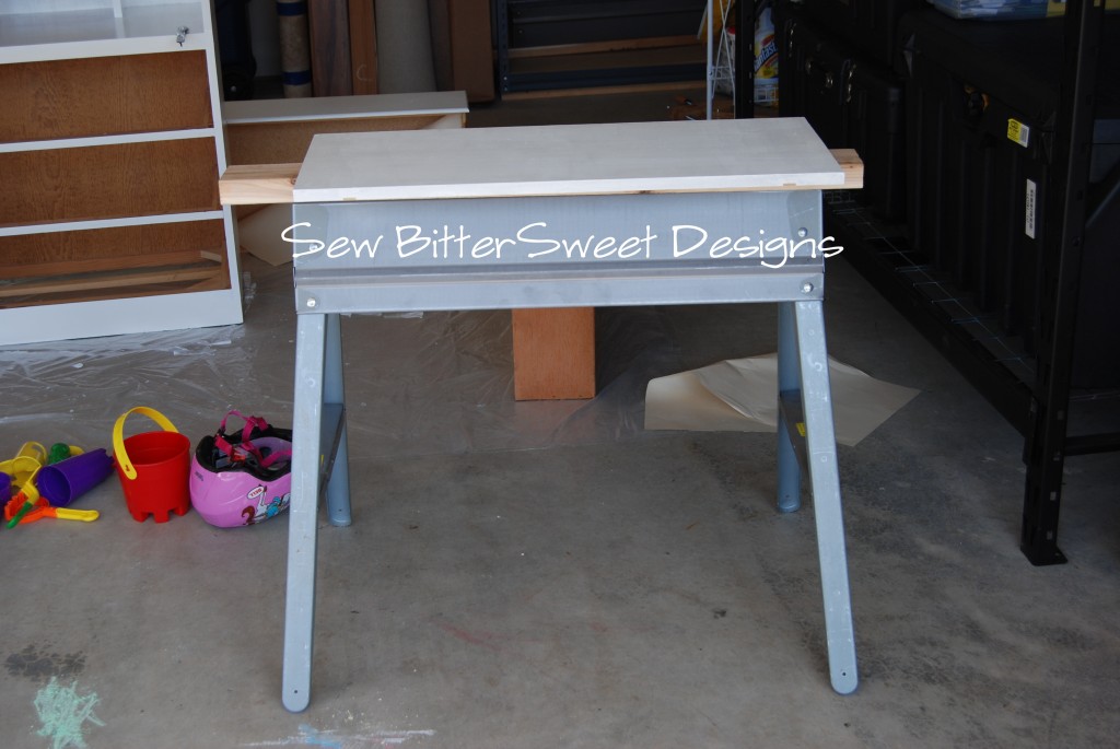 My real proud moment in all of this was figuring out how I was going to paint the desk part of the dresser. I removed it because I did it in 2 different colors (you’ll see why tomorrow). I remembered that when we built our fence last year my dad and I bought 2 sawhorses and I busted one out.