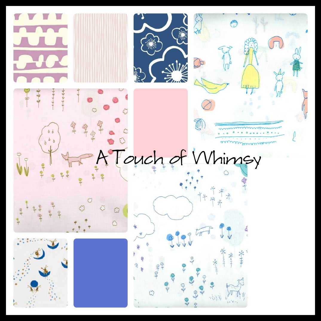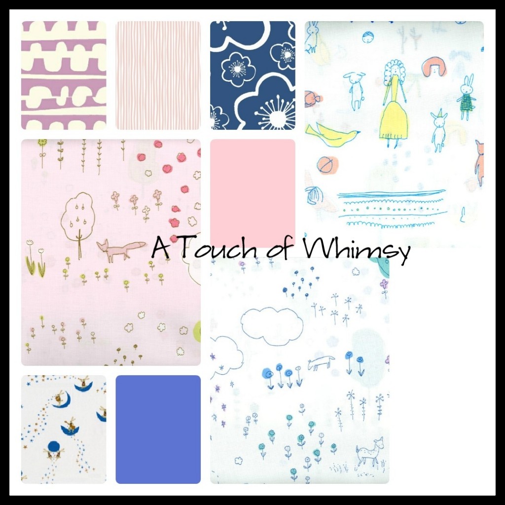 This collection consists of 4 Yuwa prints, 3 coordinating solids (Kona Whtie, Kona Medium pink and Kona Blue Jay), and 3 coordinating prints (Bella – large flower – Lotta Jansdotter, Echo – Lotta Jansdotter, and Simpatico – Straw Pinkish). You can buy this bundle here.