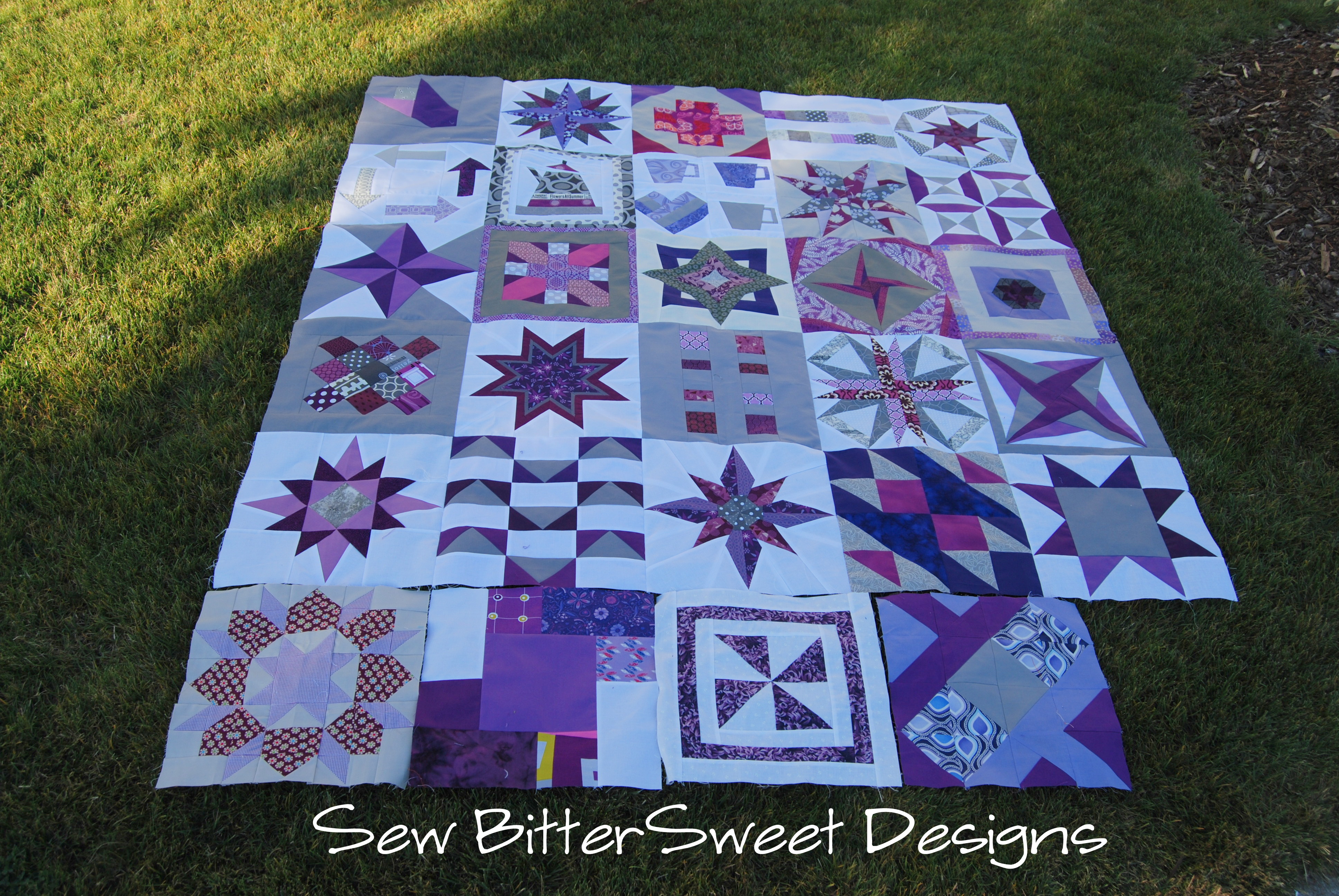 It is gorgeous Melissa! I agree with the other comments that either adding them to the front or back will work great. I think it is such an interesting quilt with all those different blocks with the various shades of purple and gray holding them together – beautiful!