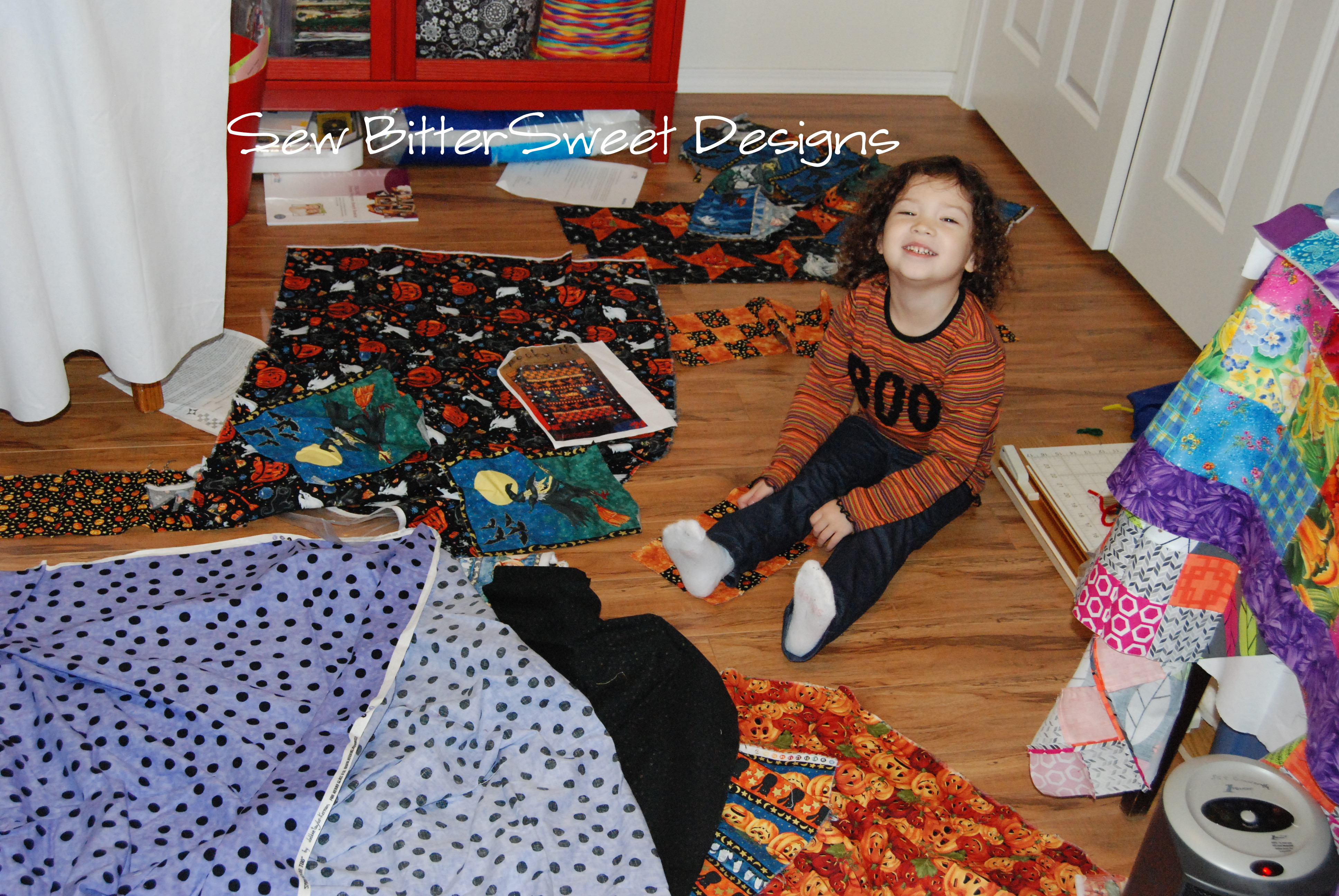 While I was pulling fabrics, Anne decided to do the same thing. She spotted some Halloween fabric in my cabinet and went on the attack! Everything was in a huge ziplock bag and she got out an entire WIP progress quilt and I’m sure from the expression on her face you can guess what she wants me to do…