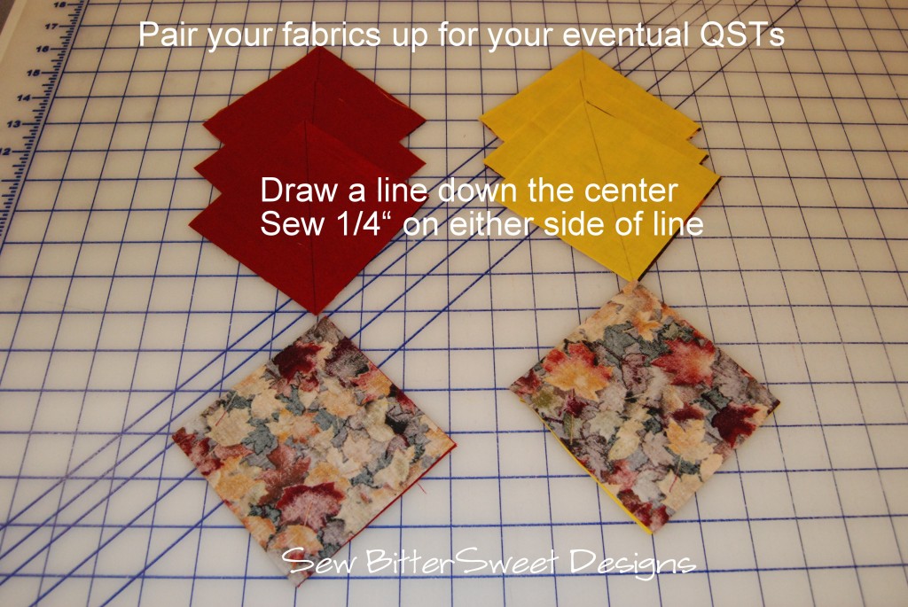 Next you will want to pair up your fabrics that will become your eventual Quarter Square Triangles (QSTs), prepare them for sewing by drawing a diagonal line corner to corner. Sew ¼” one either side of the line. Note: when you construct QSTs the first step is always to make Half Square Triangles (HSTs).