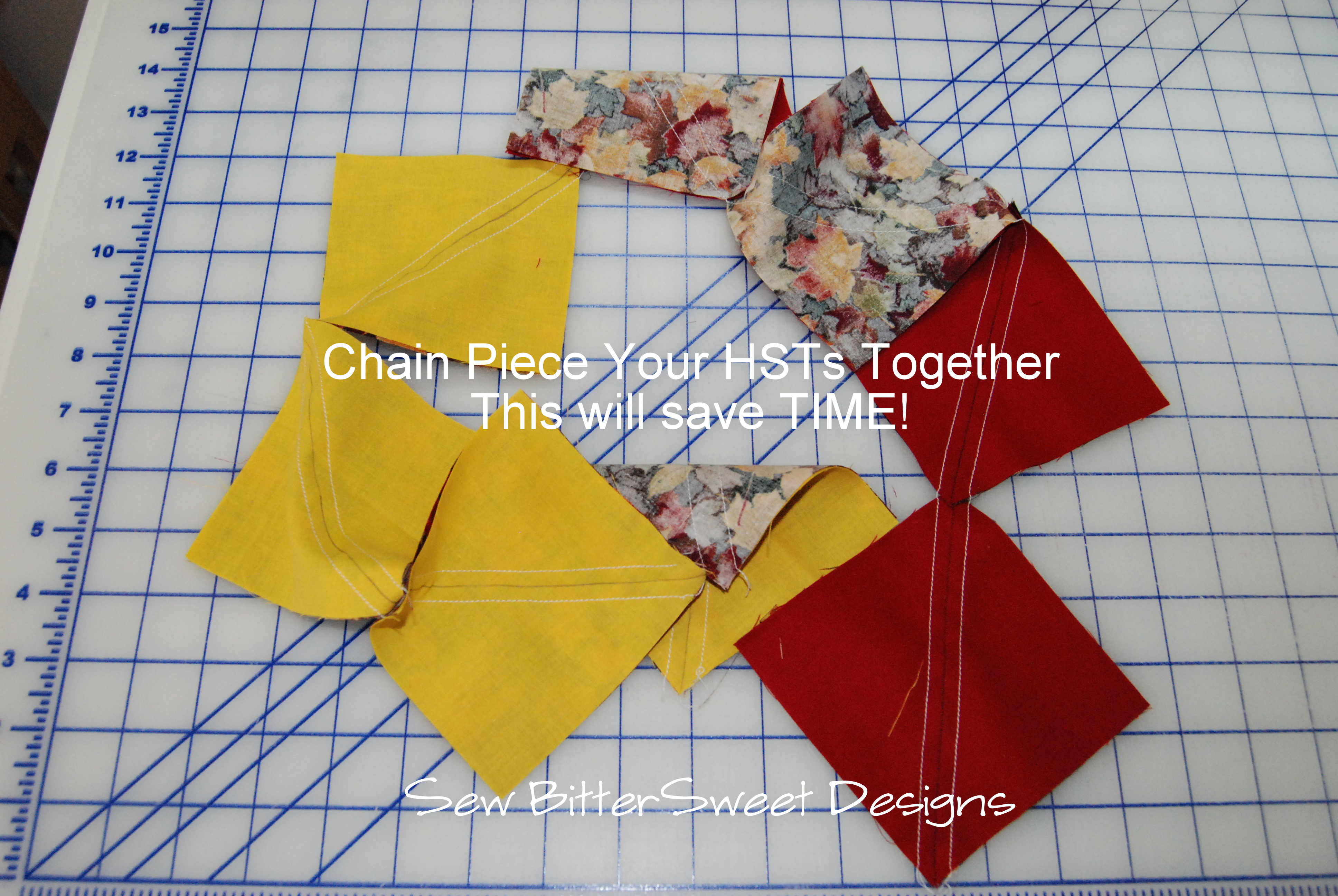 Time Saving Tip: Chain piece all of your HSTs and QSTs, and then snip them apart before you cut them in half!