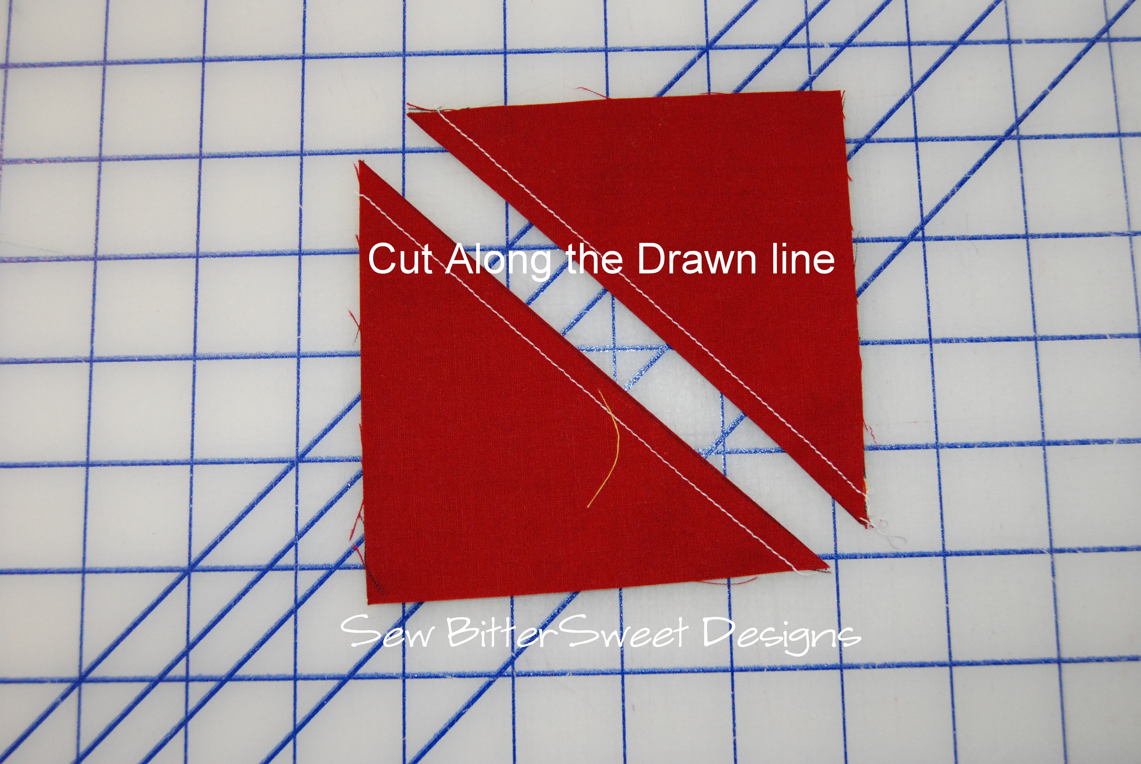 Sew ¼” one either side of the drawn line on the 4 1/8” square.