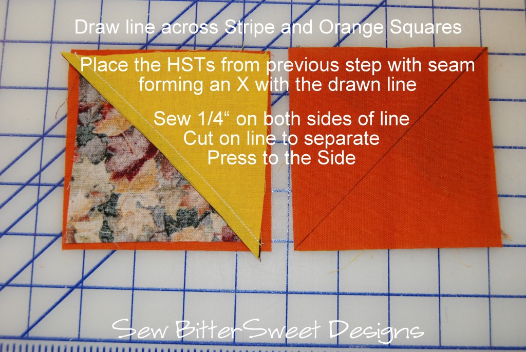 Next take your squares measuring 4 1/8” and draw a line corner to corner as you would for HSTs (for my block this is the solid orange and the stripe fabric pictured). Then you will want to center the already made HSTs (which will become your QSTs) on the square right sides together. You will want to make sure that you are making an X. The seam from your HST should cross the drawn line diagonally; you DO NOT want them to line up!!!