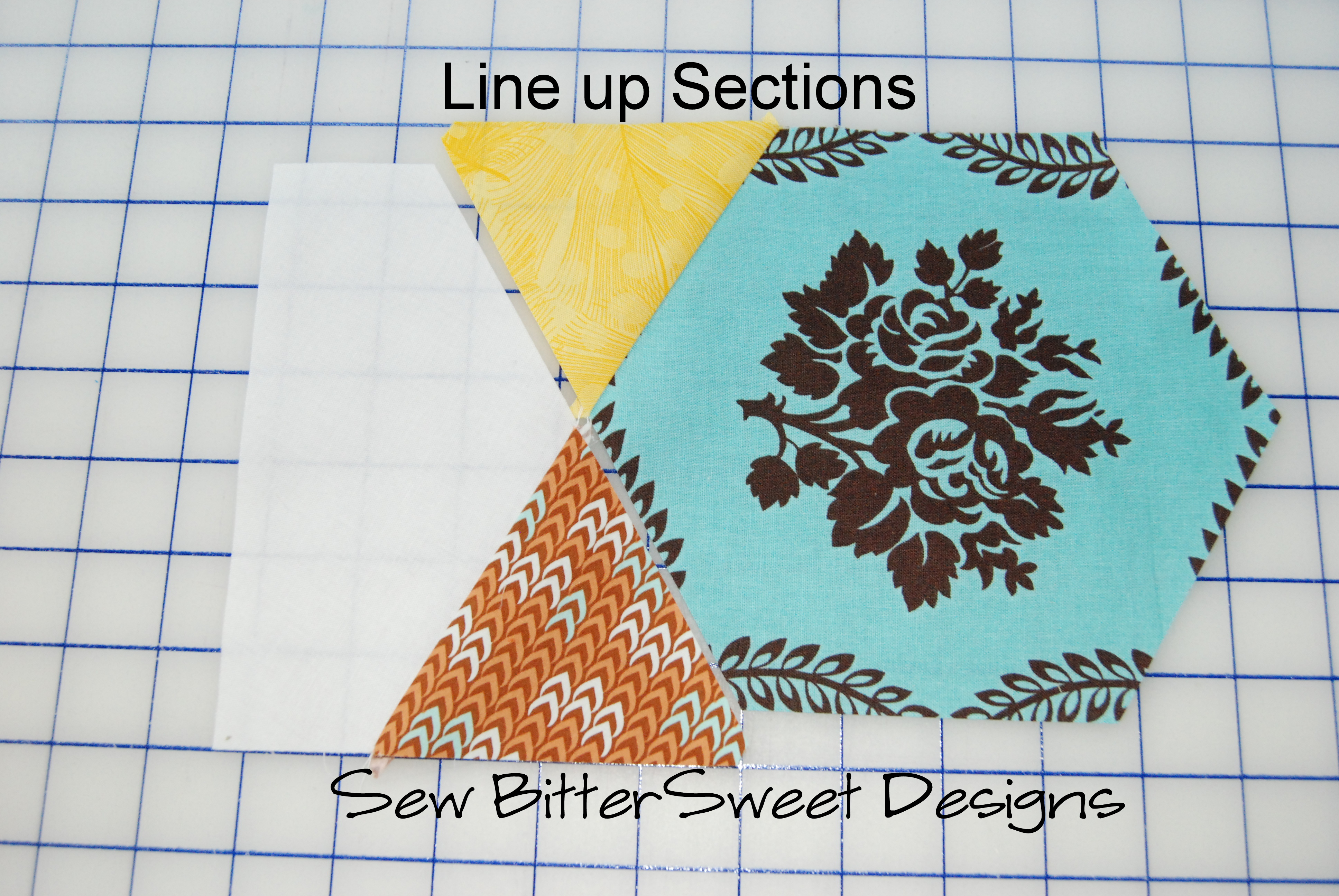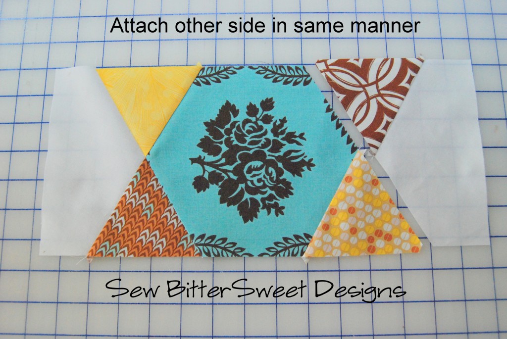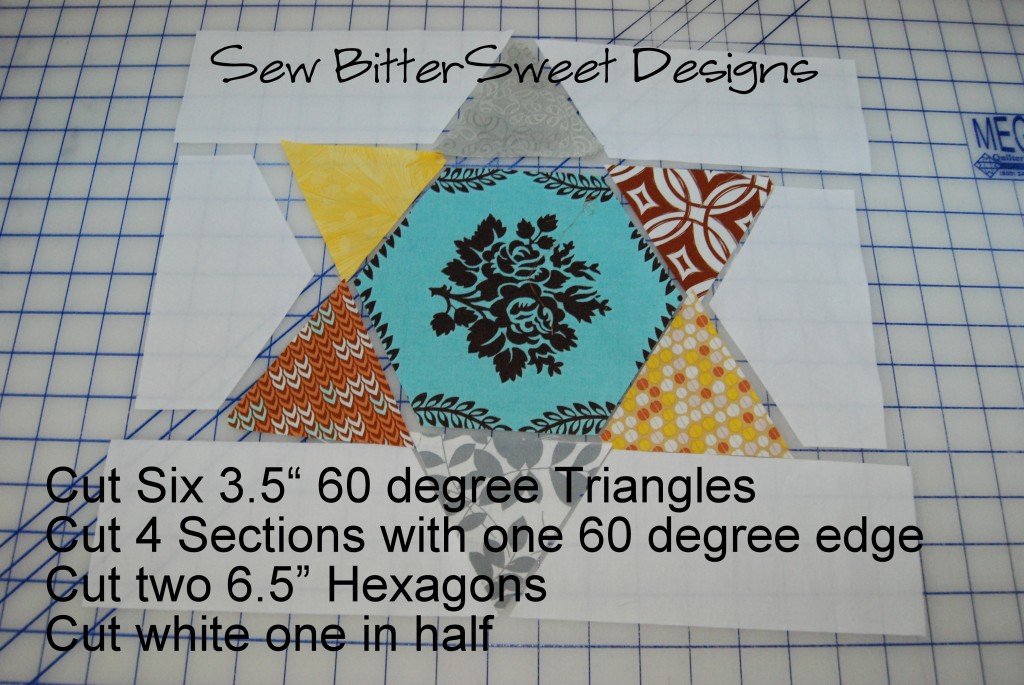 I fussy cut the center hexagon block. Take you white hexagon and cut it in half on the flat edges. Do not cut point to point.