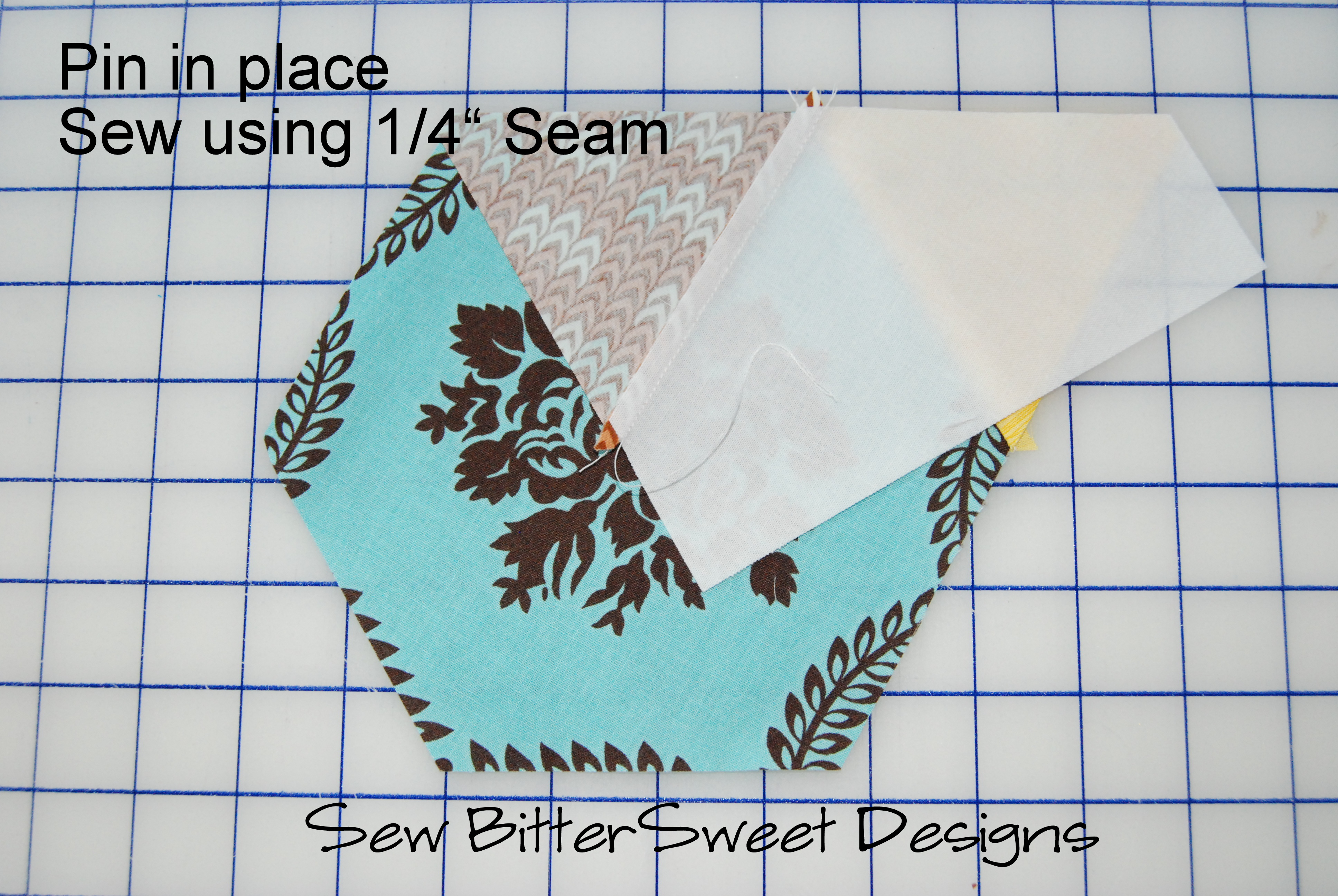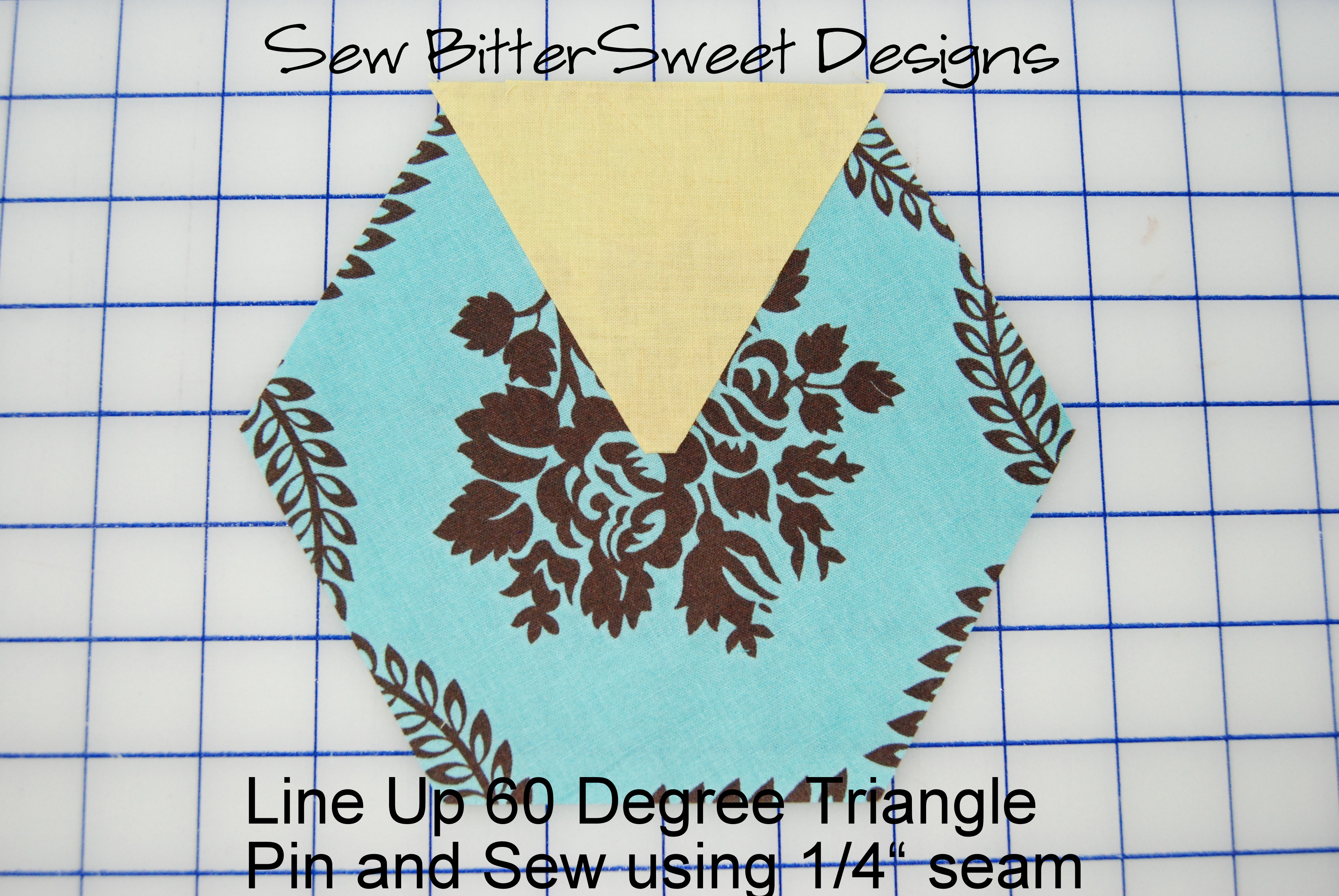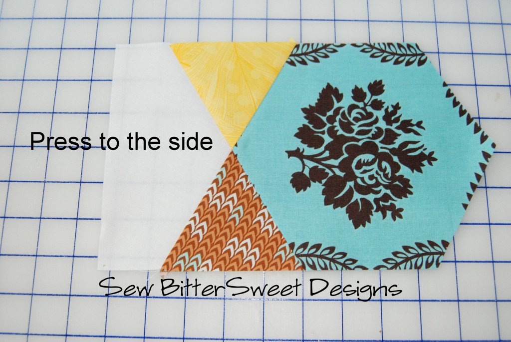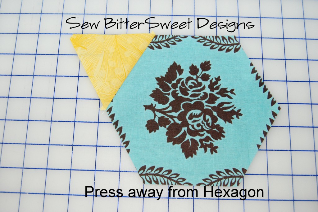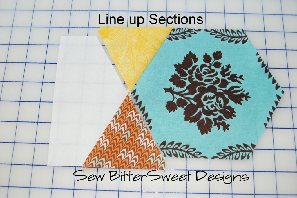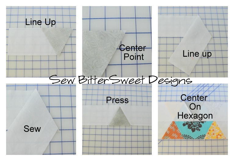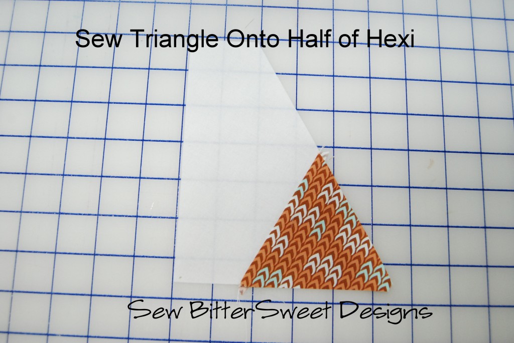 Sew first triangle to center hexagon. Line up as pictured in the picture below.
