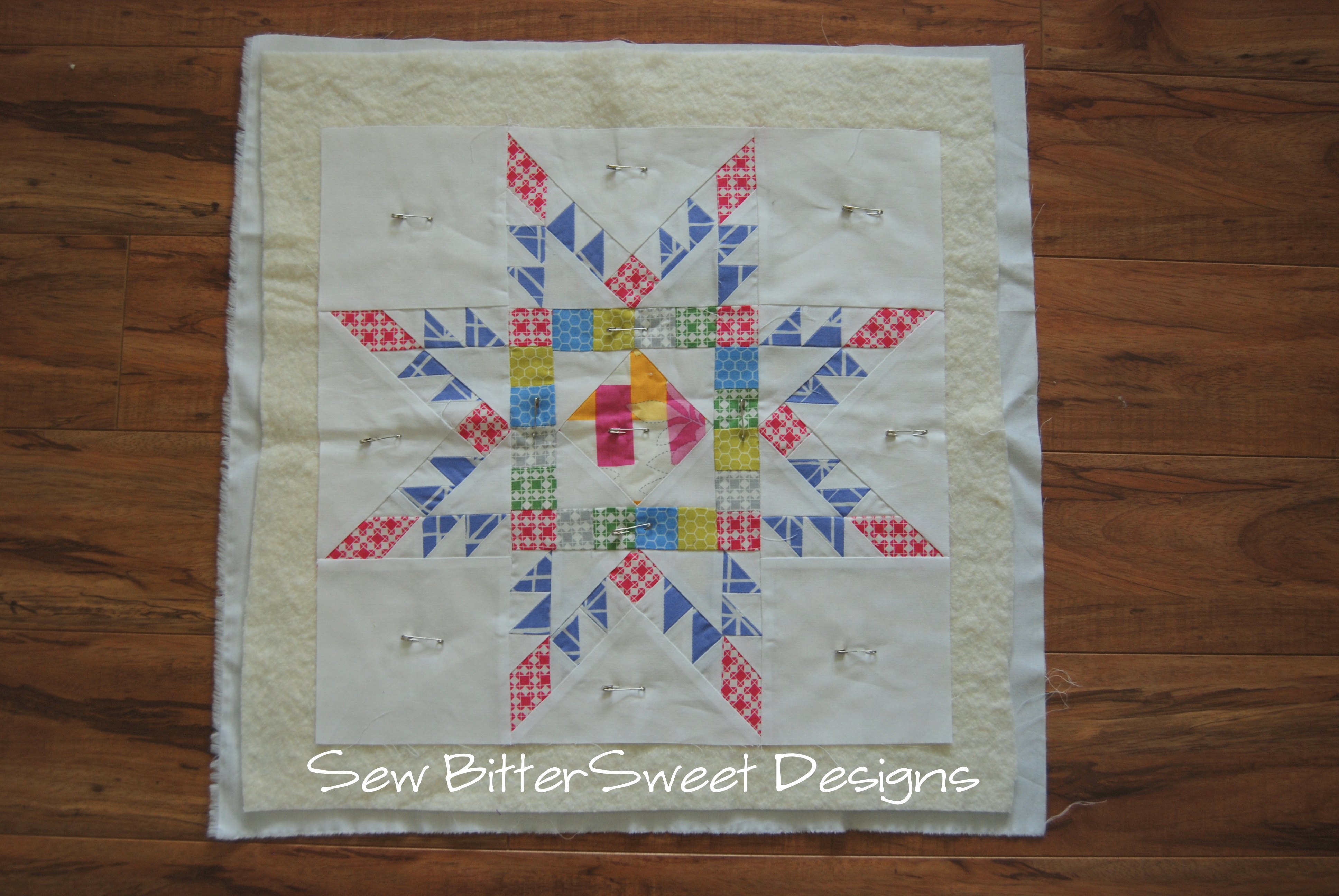 Step 1: Baste your quilt block – this project is so small that I decided to pin baste my block. Leftovers Pillow Basted