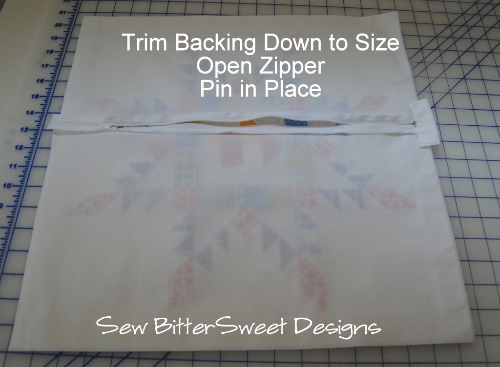Step 6: Trim backing down to same size as quilt block – make sure you OPEN the zipper!!!
