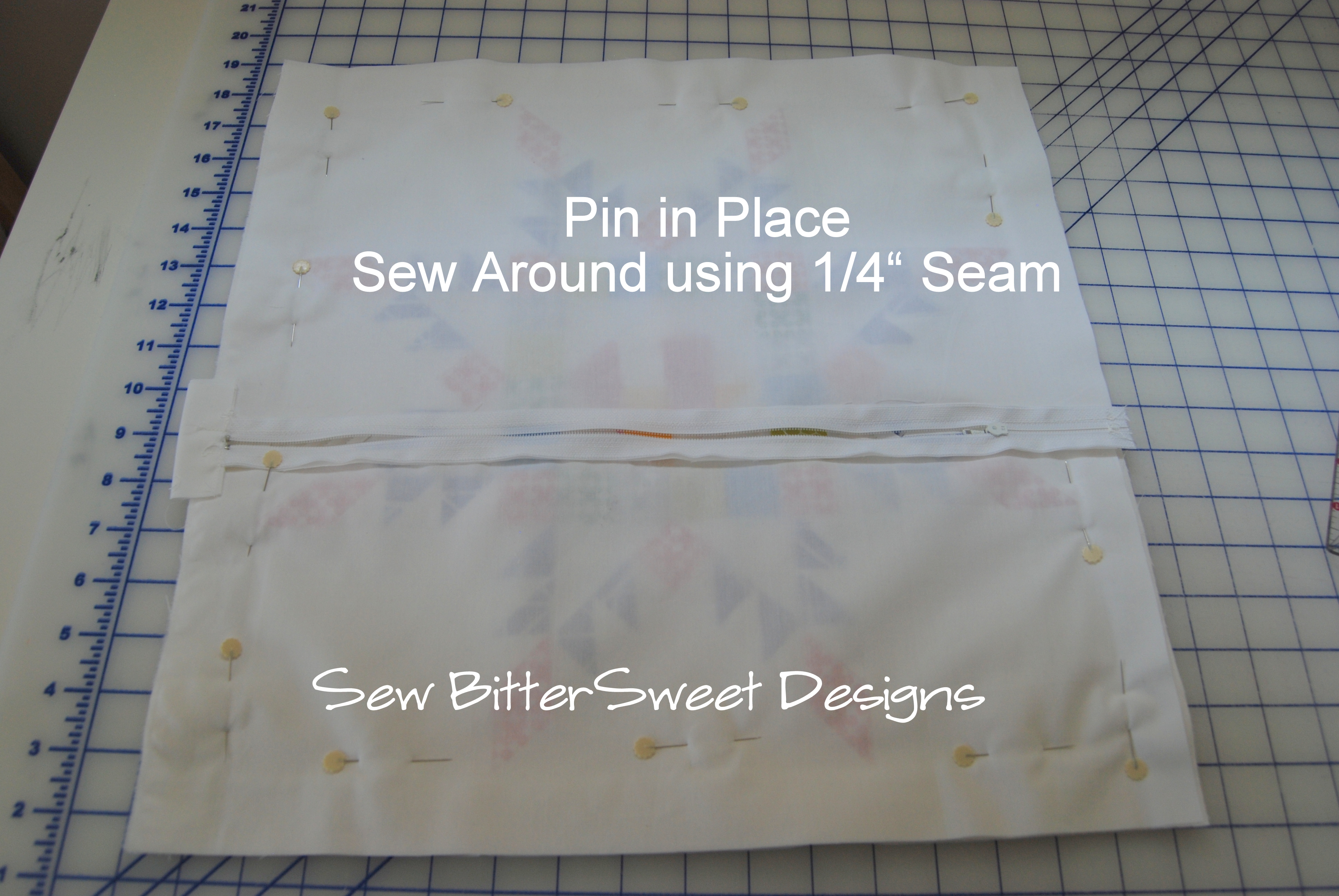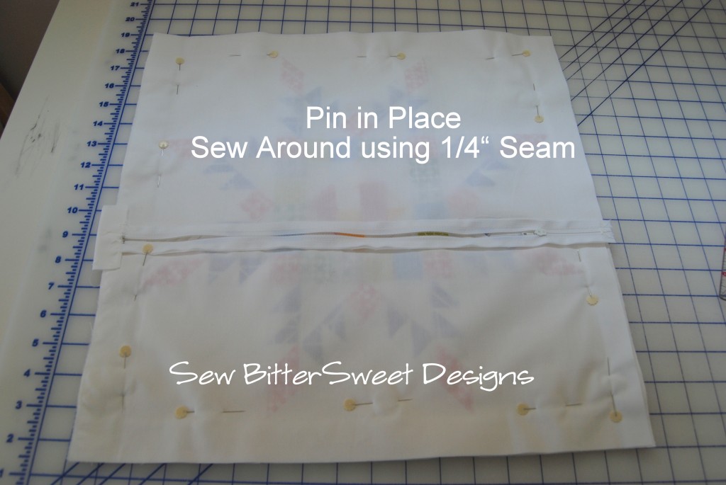 Step 7: Pin and all the way around and sew using ¼” seam, trim corners