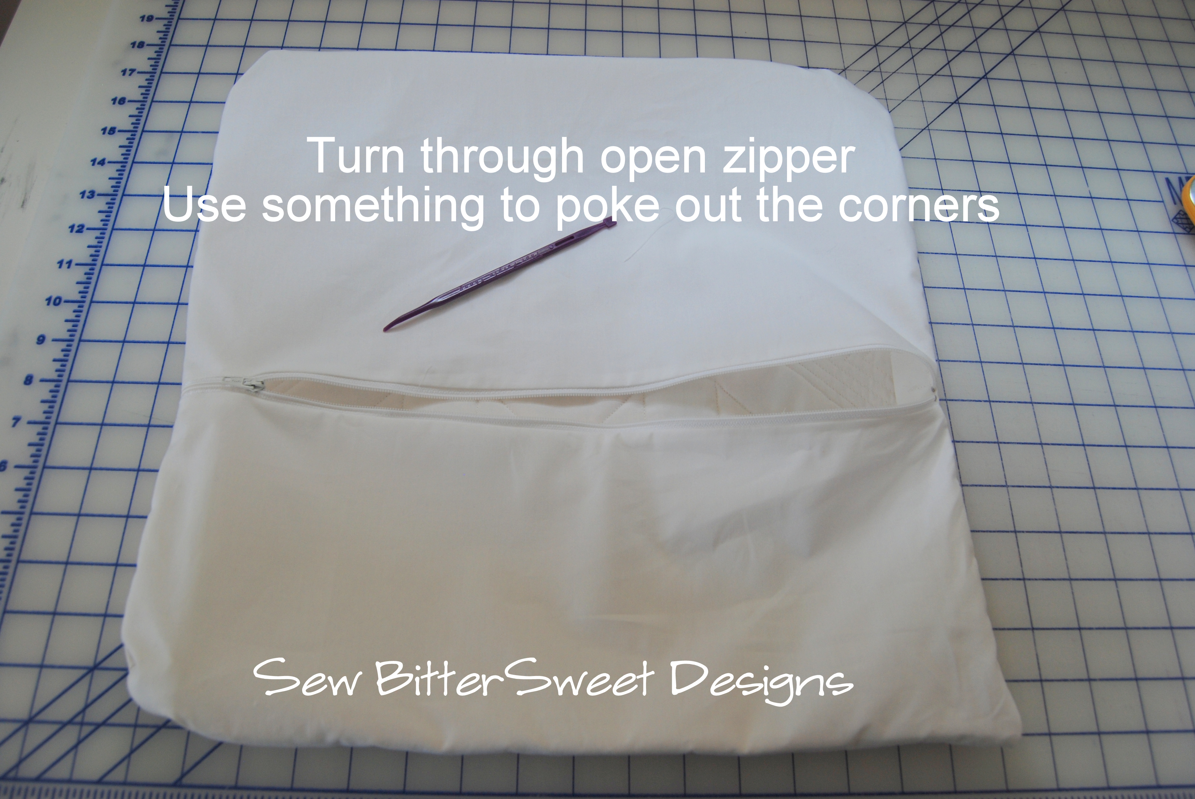 Step 8: Turn Through the zipper and use something to push out the corners – I used my purple thang, but almost anything will work!