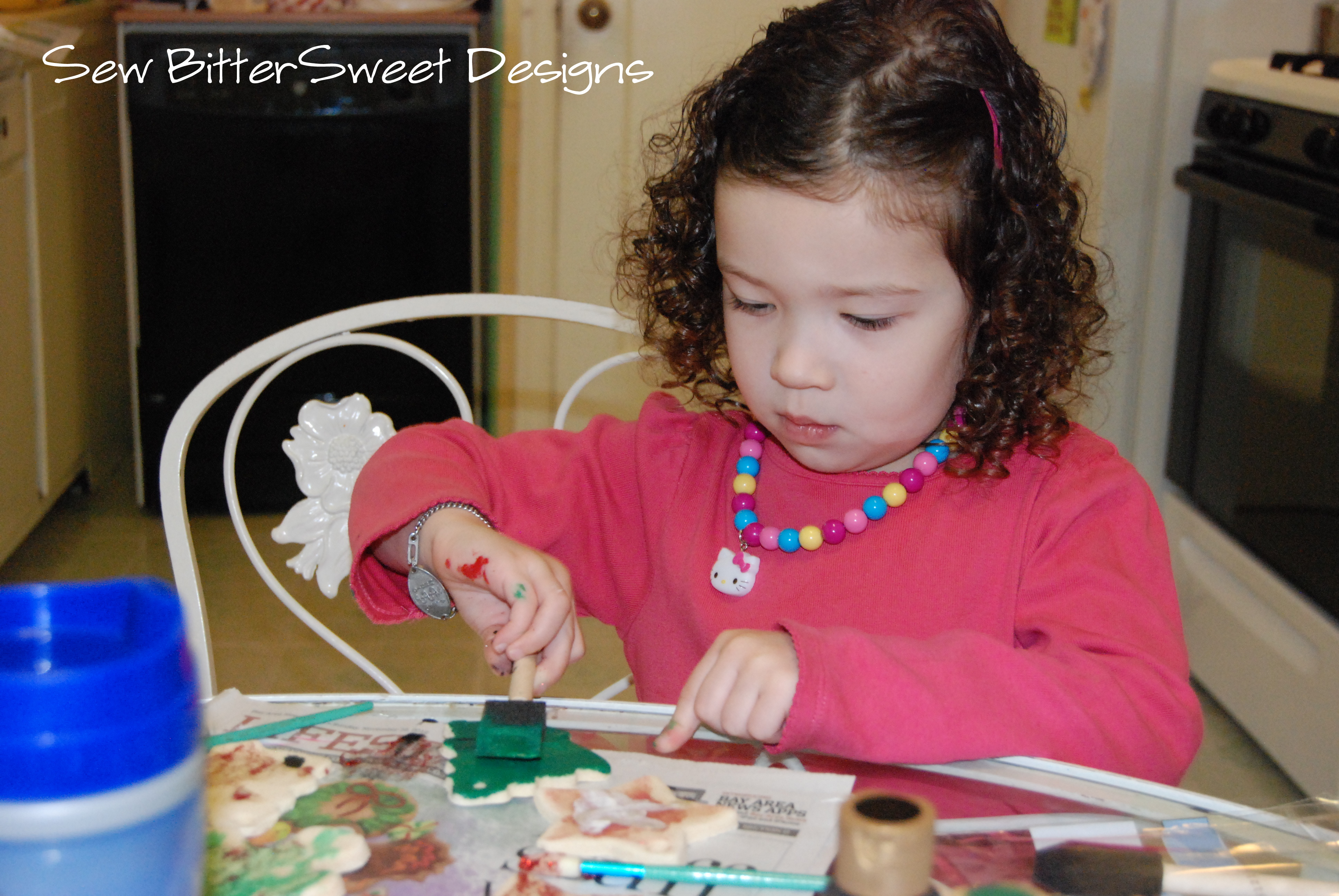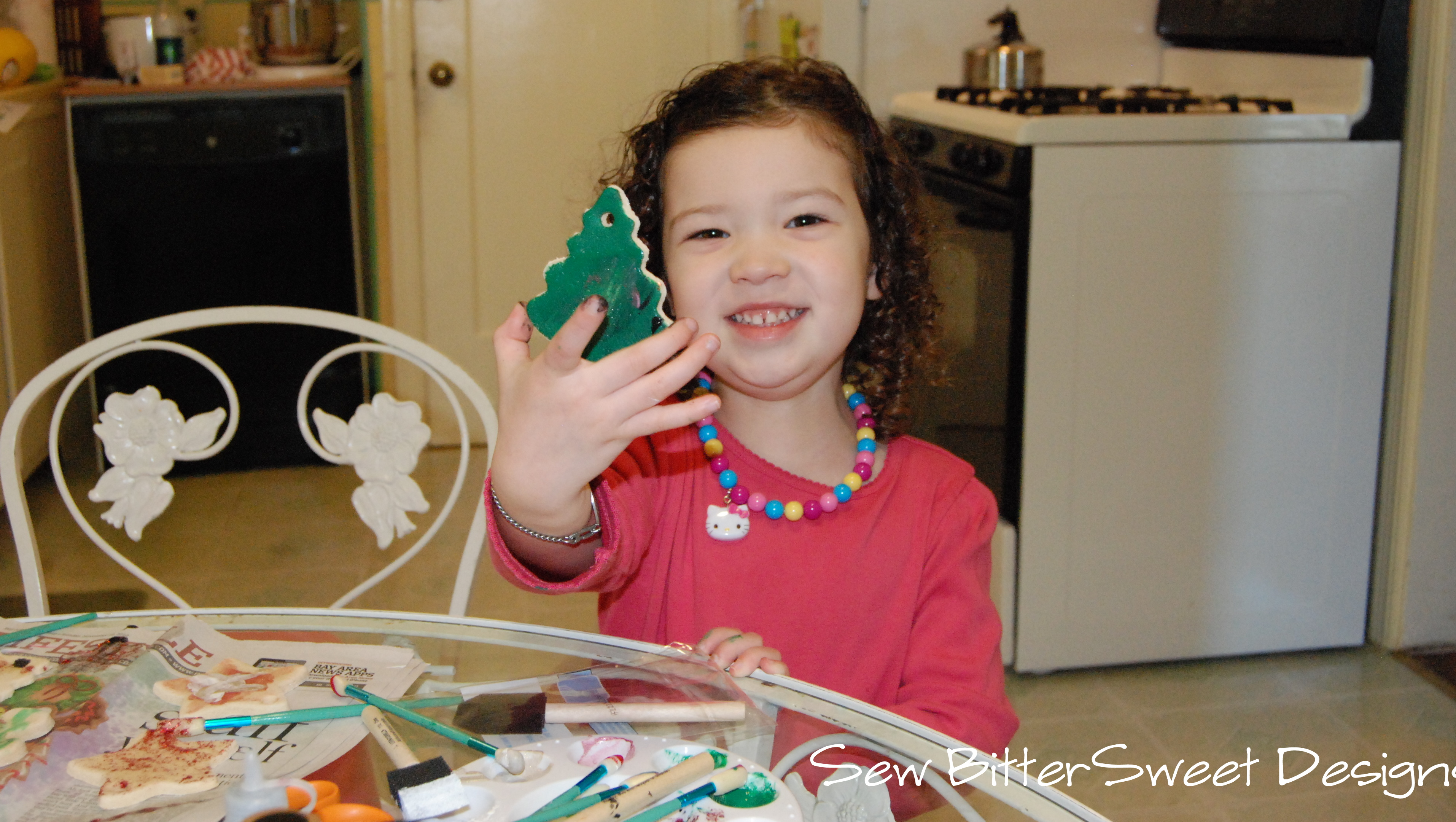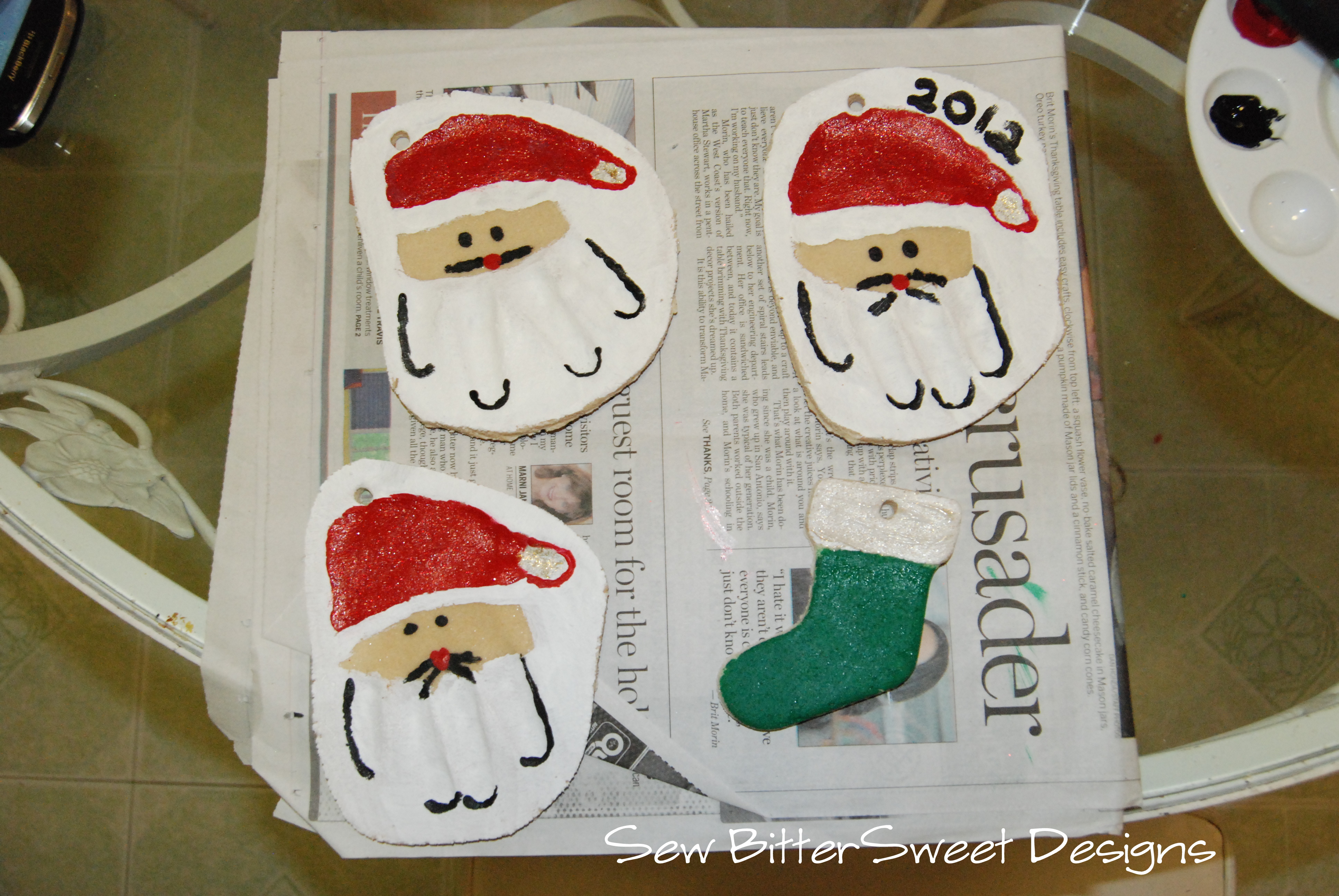 (Basic recipe – 1 cup salt, 1 cup flour, 1/2 cup water, if you dough is too dry to hold together add a bit more water. Roll out your dough to 1/4″ thick, cut desired shapes, bake at 220 degrees for 2-3 hours being to sure to flip half way. Then paint and seal with a varnish or gloss finish mod podge.)