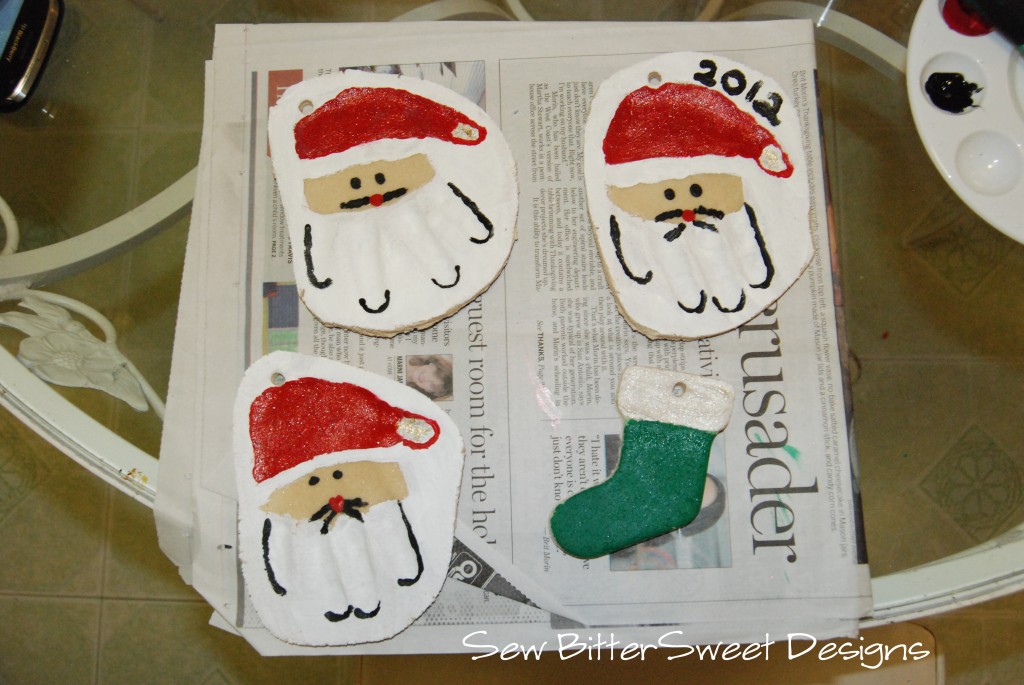 The idea for the Santa Hands came from a picture that was circulating around Facebook. From our batch of salt dough following the recipe above, we got 3 Santa hands and 5 medium sized ornaments.