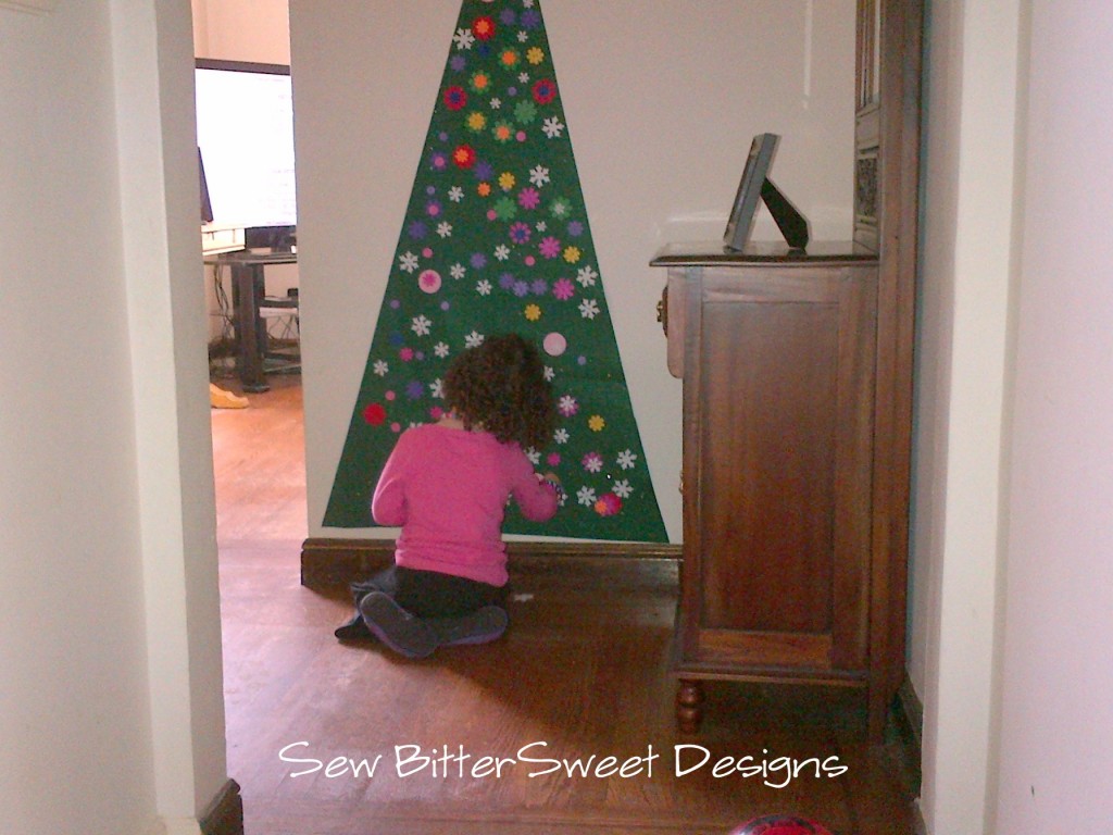 This is our take on the ever popular Felt Christmas Tree from Pinterest, here is the one I pinned last year. Here is Anne decorating ours in a nice retro Flower Power style – what can I say, she is a girly girl!