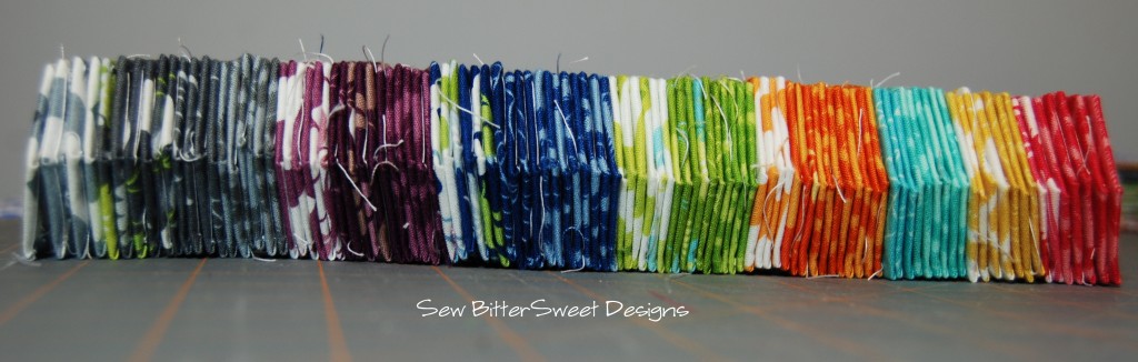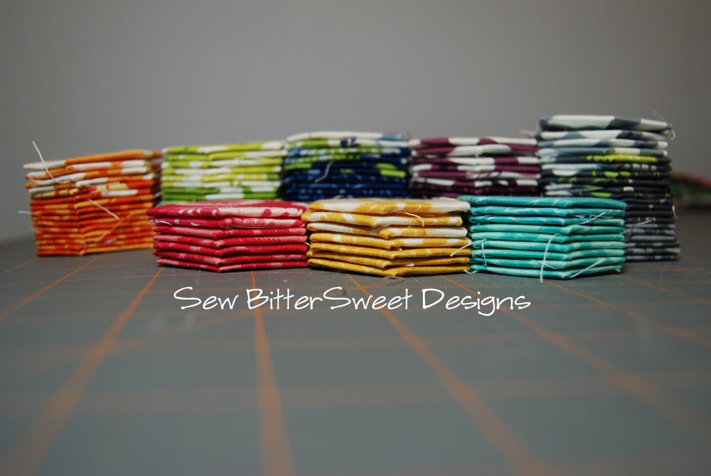 Hexies! I bought 2 charm packs of Simply Color by V & Co from Quilting Lodge. Cut one of them into quarters and I started basting. The pictures that follow show about 1/2 of the squares – just over 100 hexies.