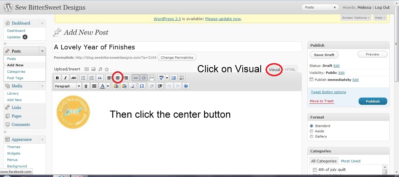 Next you will want to click on the Visual Tab at the top to go back to the normal editor. Then click on the image and center it.